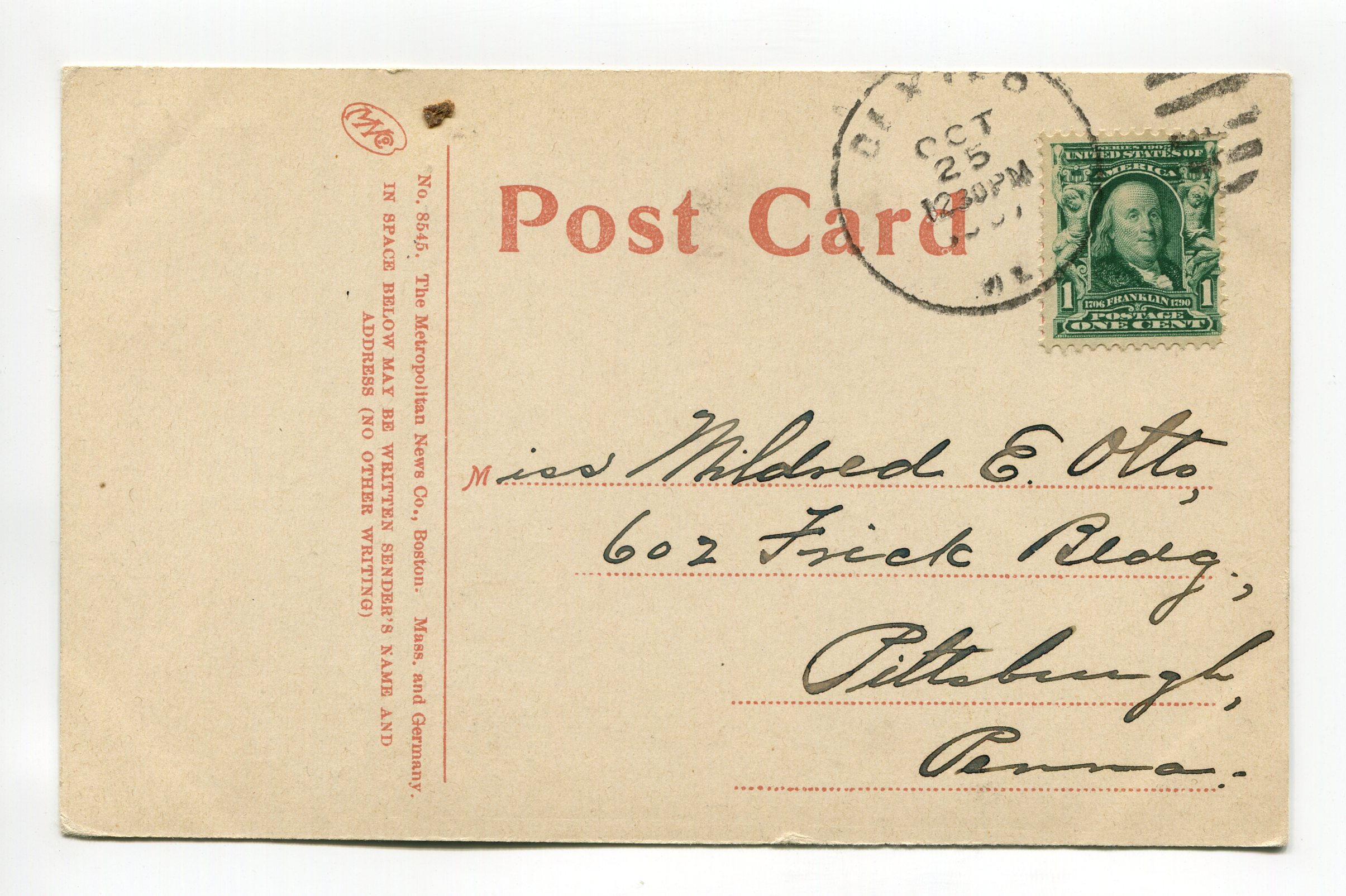 Condition – noticeable corner/edge wear, crease in corners and by left edge above center, album impression marks around corners, cancellation impression/marks visible on card front, writing and marks on card front, soiling/marks