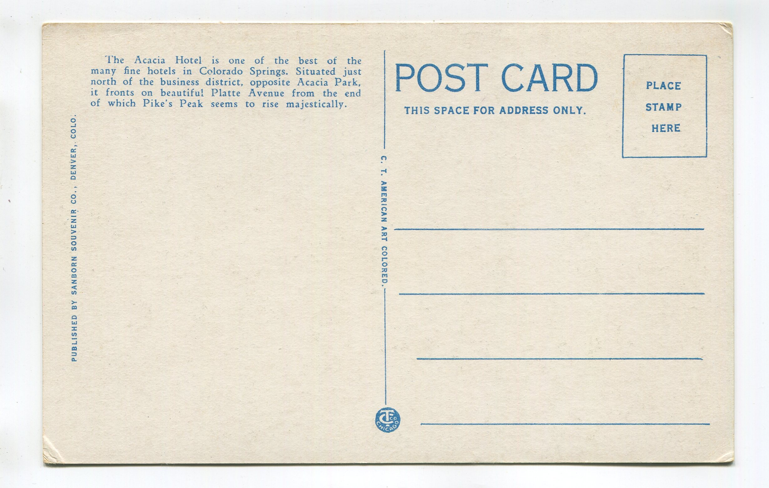 Acacia Hotel showing Platte Avenue with Pike’s Peak in Distance Colorado Springs Colorado postcard