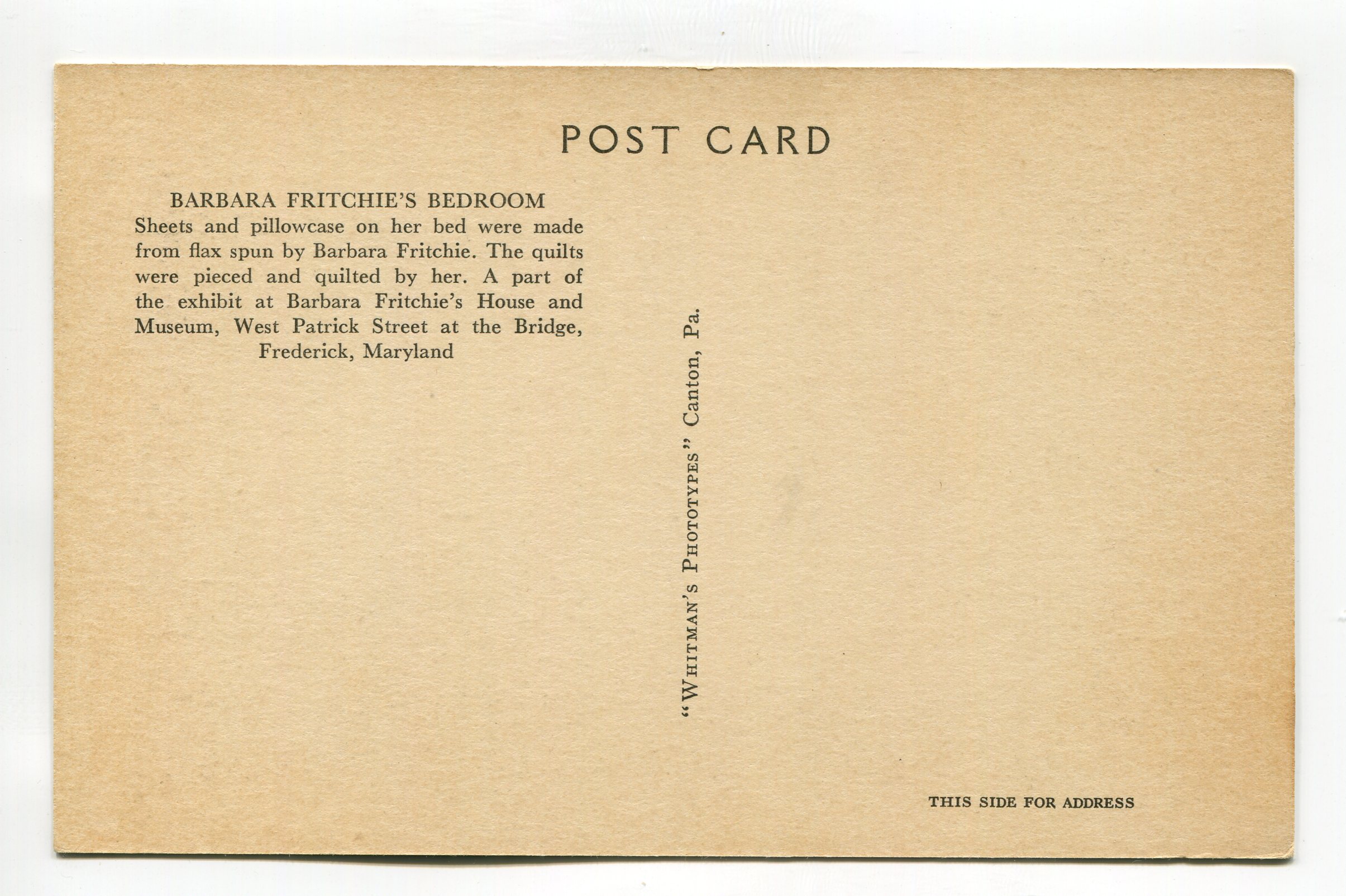 Barbara Fritchie’s Bedroom Frederick Maryland postcard