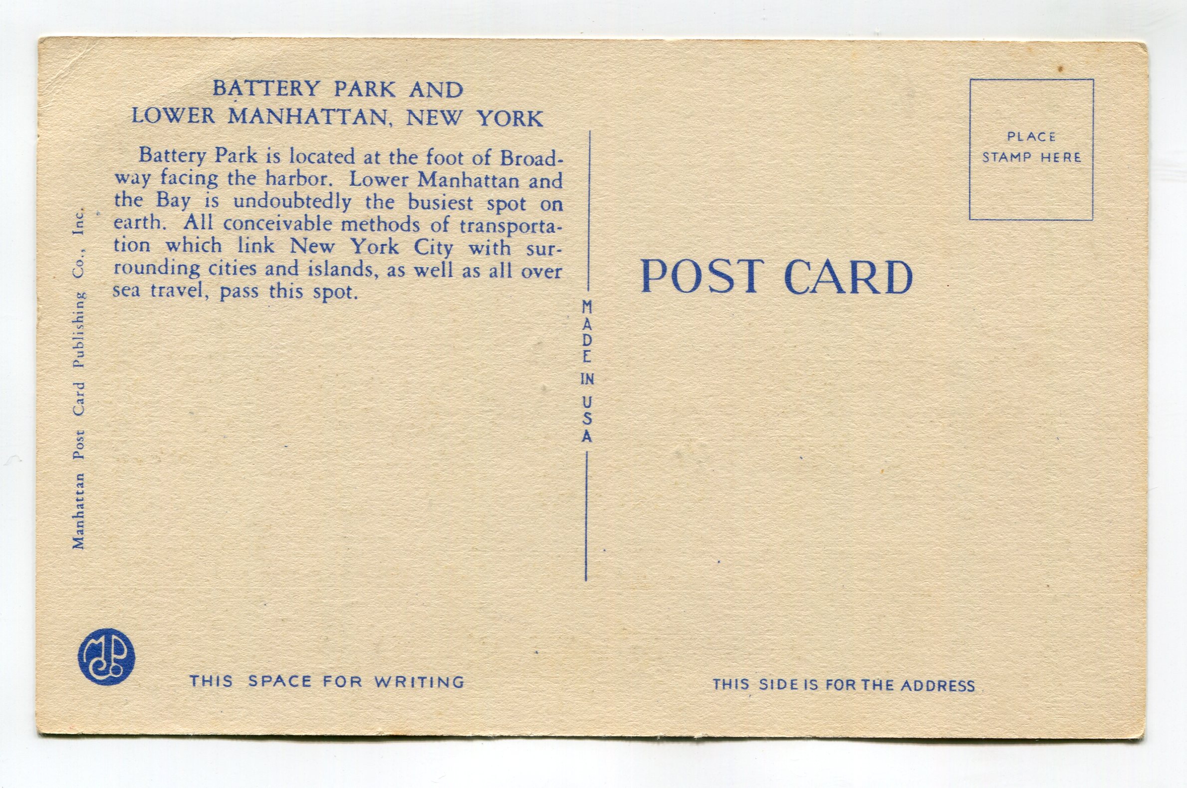 Battery Park and Lower Manhattan New York postcard