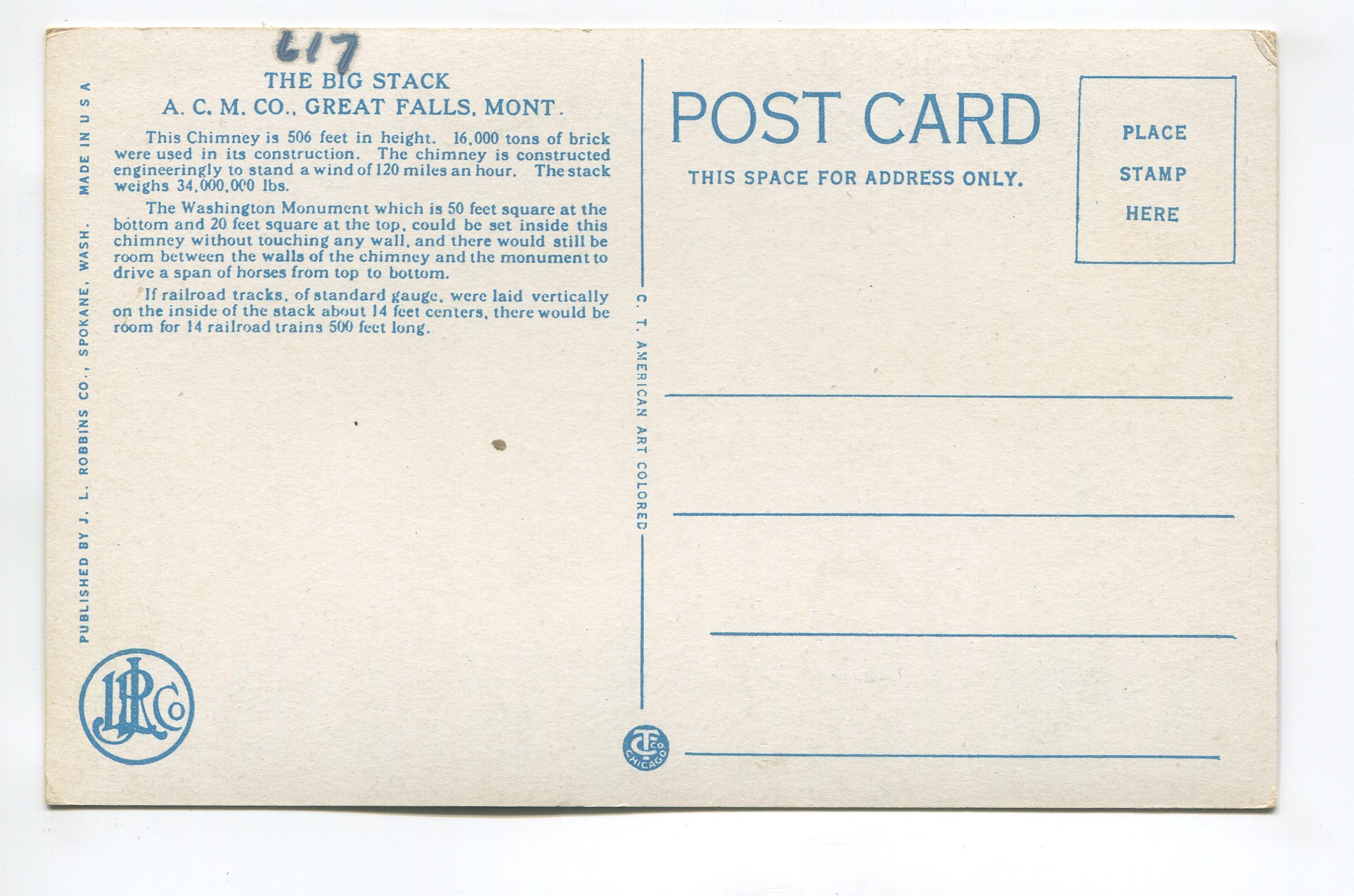 Big Stack Anaconda Copper Mining Co Great Falls Montana postcard