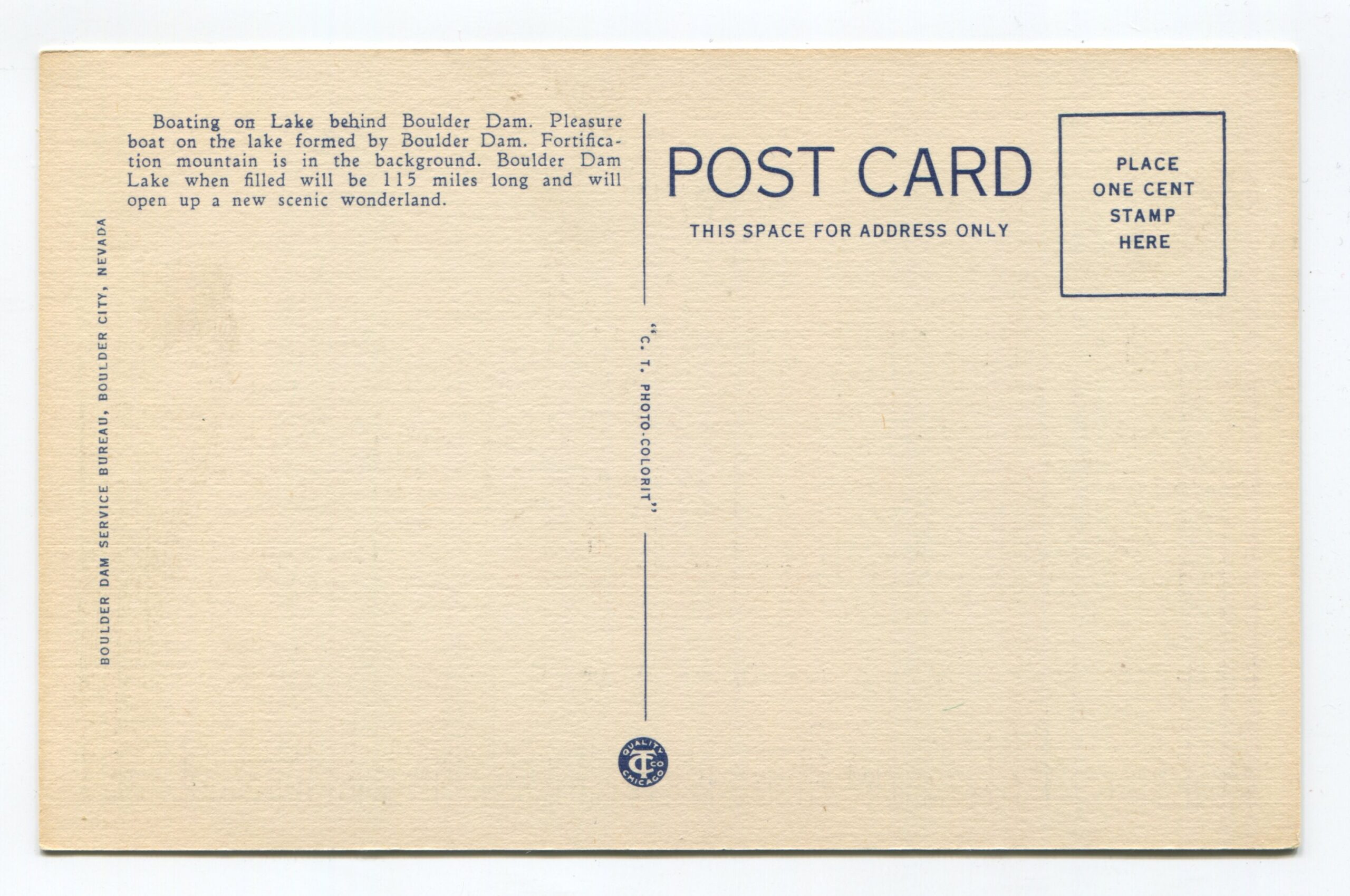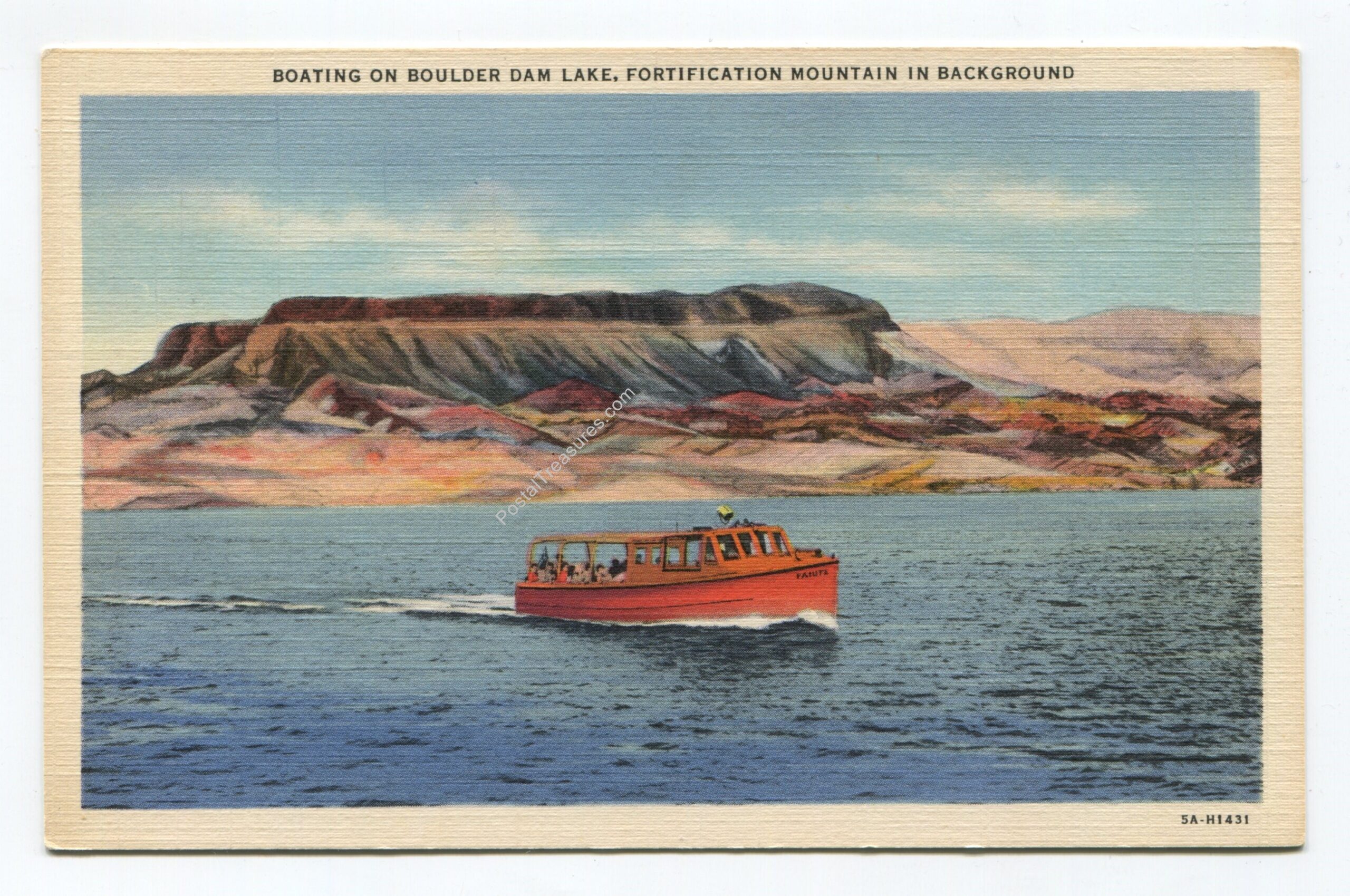 Boating on Boulder Dam Lake Fortification Mountain in background postcard