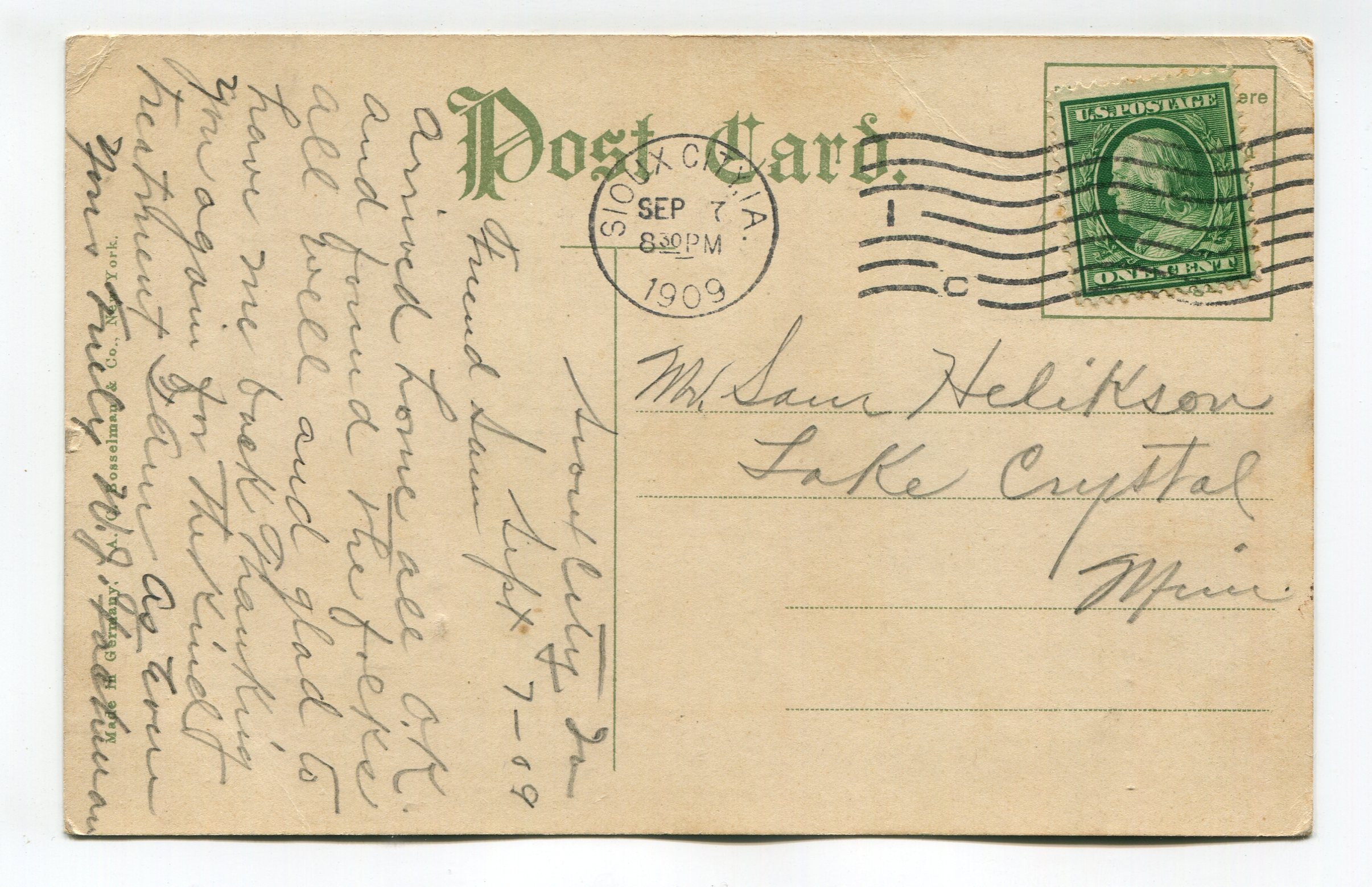 Condition – noticeable corner/edge wear, crease in corners and in top edge left of center, crease by both top corners, cancelation impression visible on card front, indentation spots lower right of card center, album impression marks around corners, marks on card front, soiling/marks
