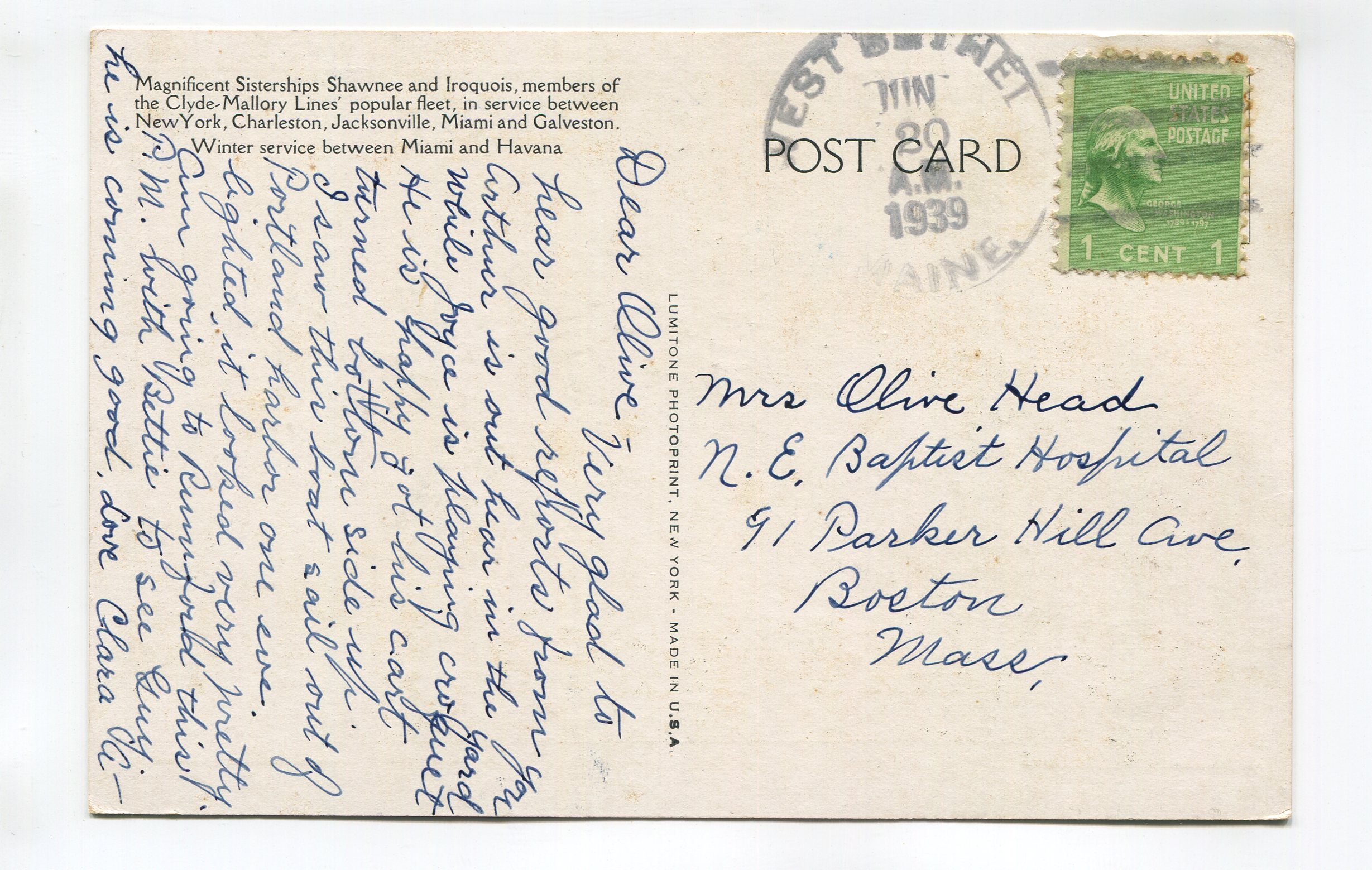 Clyde-Mallory Lines – Sister Ships Shawnee and Iroquois postcard