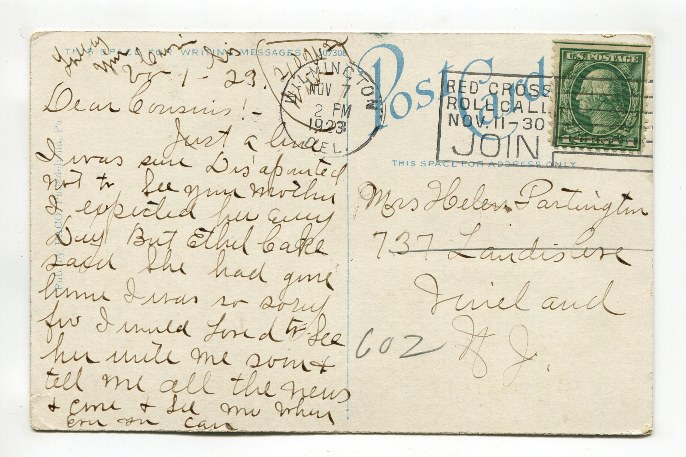 Condition – noticeable corner/edge wear, cancellation impression and marks visible on front, tear in right edge near bottom corner, heavy indentation line from message visible left of card center, soiling/marks