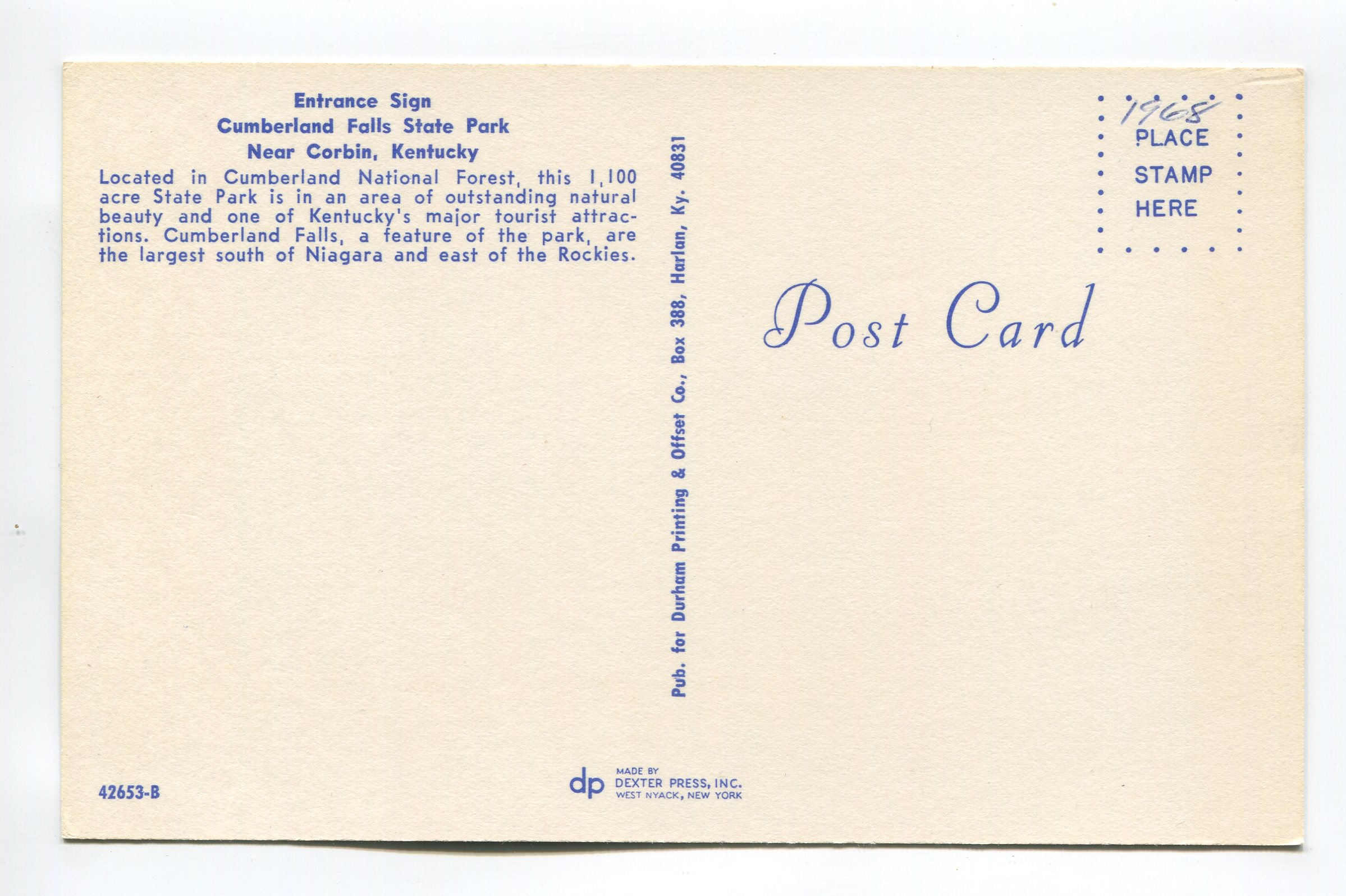 Entrance Sign Cumberland Falls State Park Near Corbin Kentucky postcard
