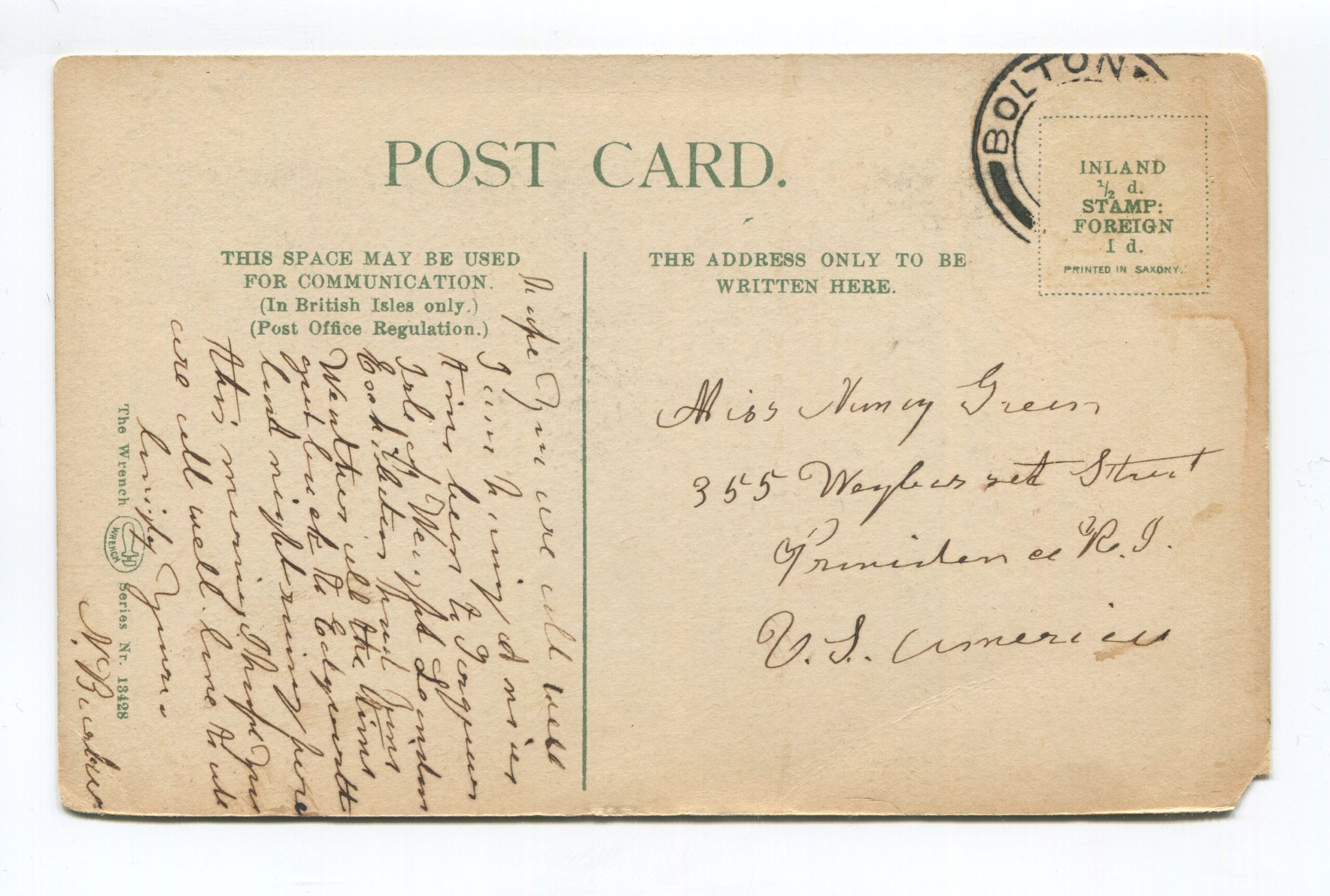 Condition – noticeable corner/edge wear, crease in corners and by top left and bottom right corners, crease in bottom edge left of center, vertical crease by left edge, raised horizontal line due to rear indentation visible below top edge, cancelation impression visible on card front, bottom left corner tip missing, stain in upper left edge, marks on card front, soiling/marks