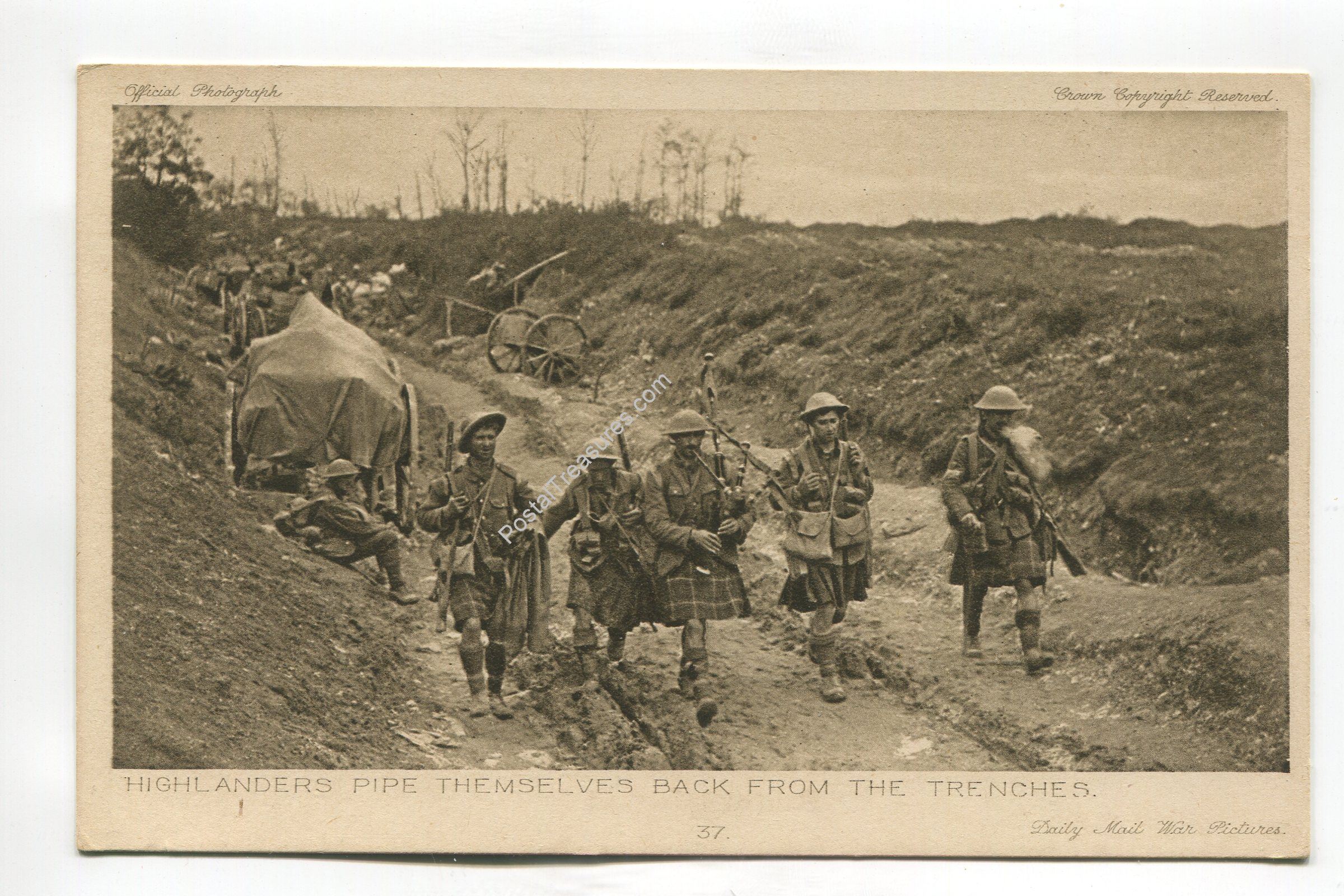 Highlanders pipe themselves back from the trenches postcard