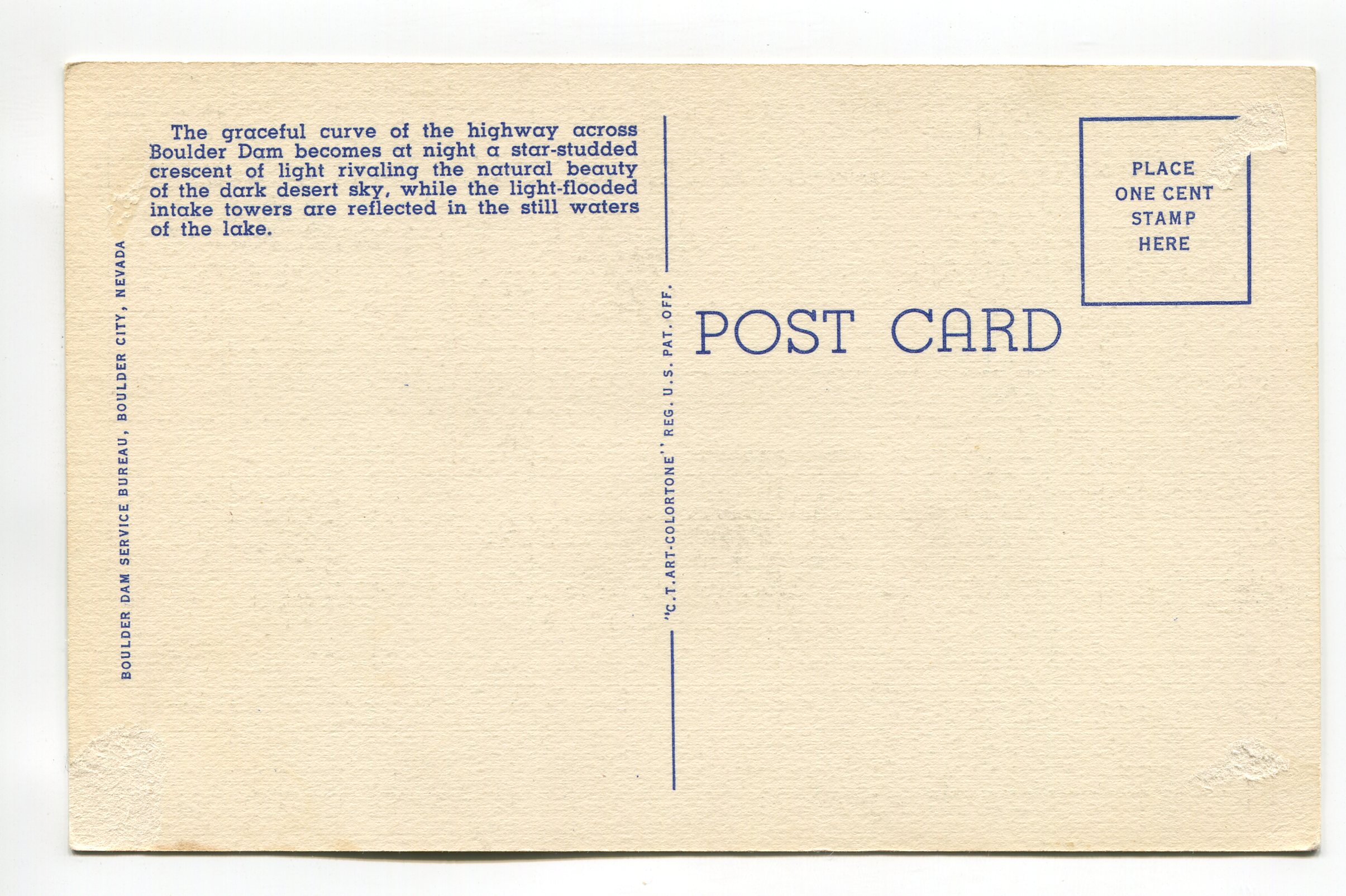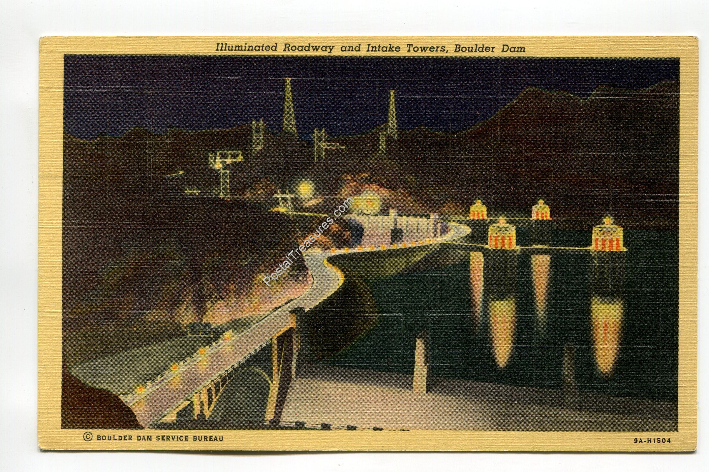 Illuminated Roadway and Intake Towers Boulder Dam postcard
