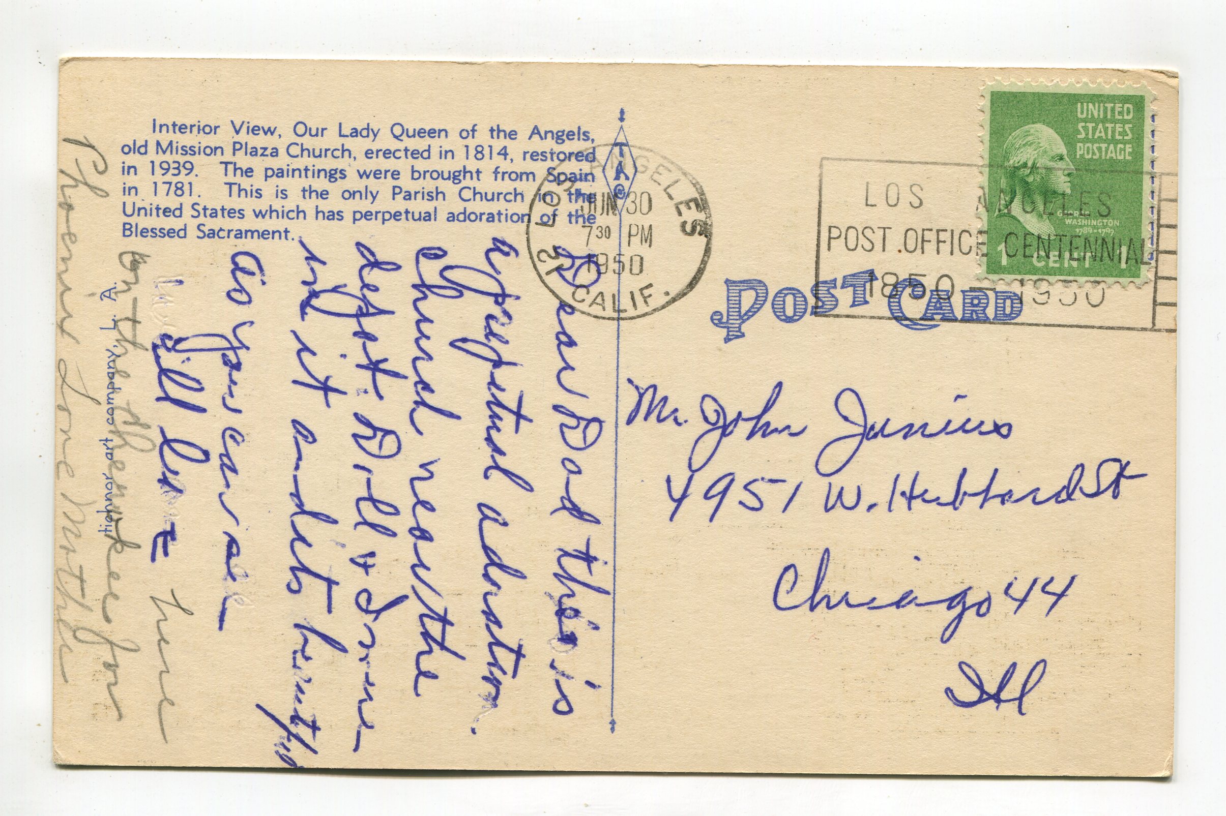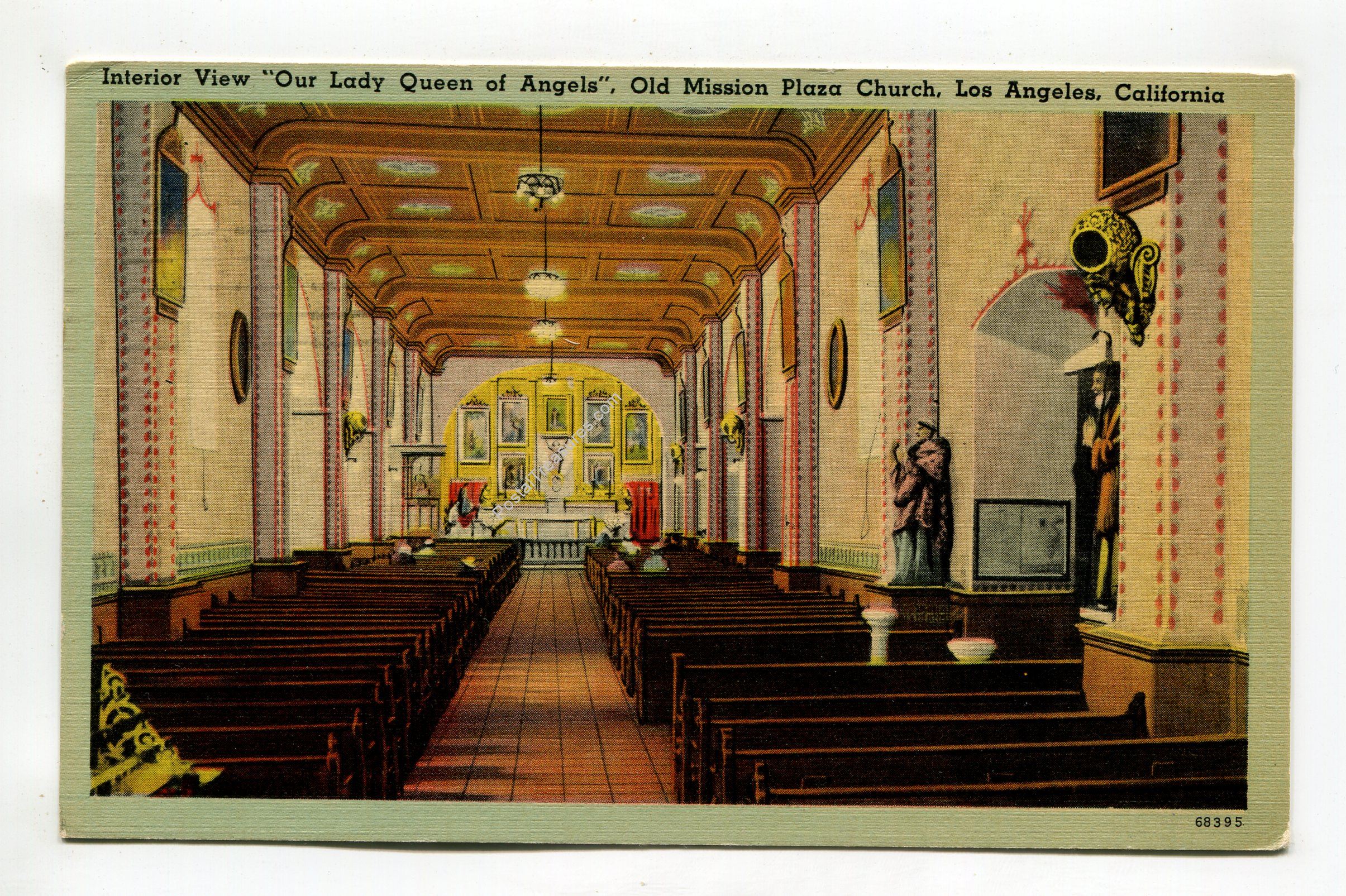 Interior view Our Lady Queen of Angels Old Mission Plaza Church Los Angeles California postcard