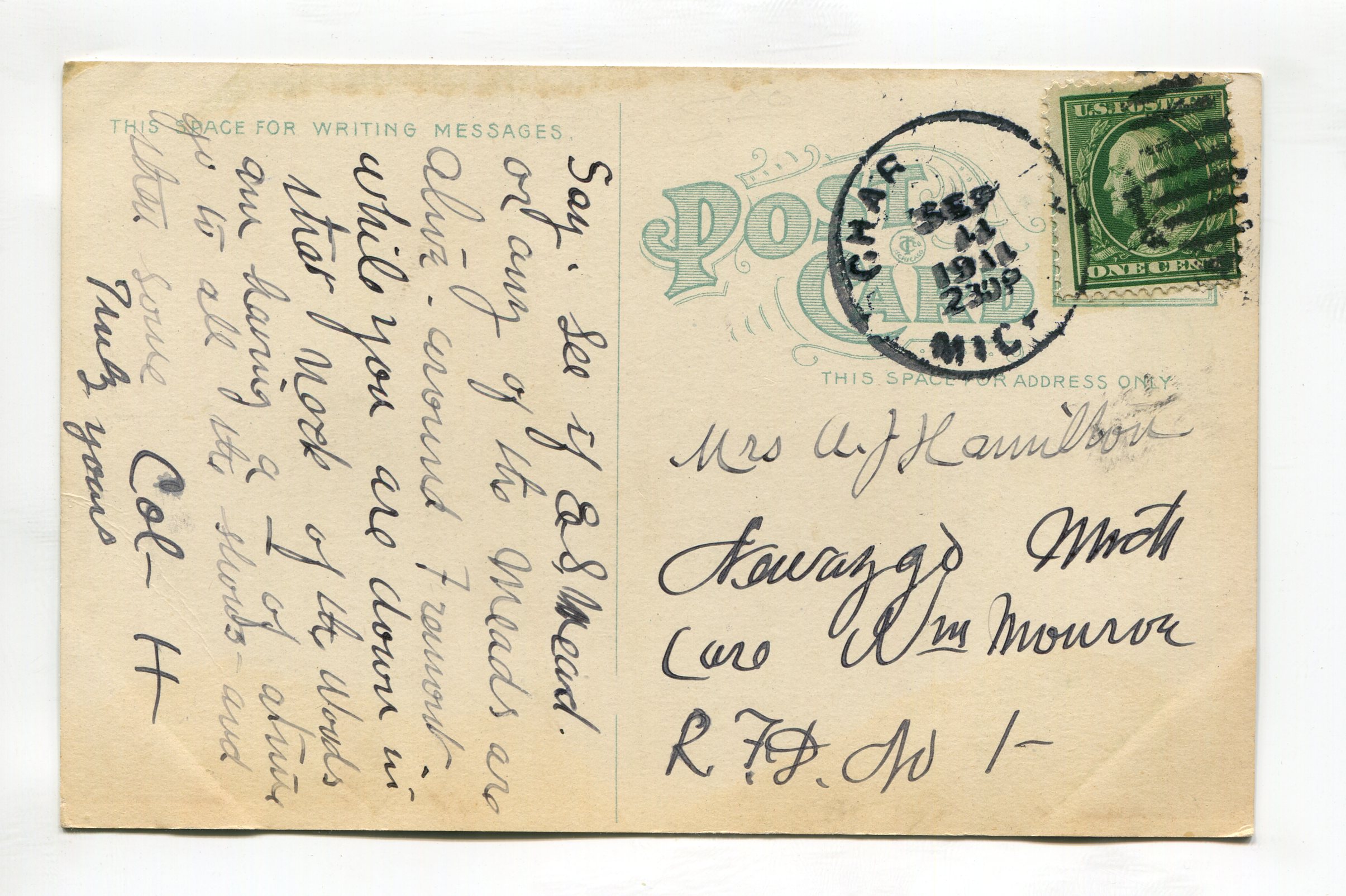 Condition – noticeable corner/edge wear, crease in corners and in lower right edge and in top edge left of center, cancellation impression visible on card front, album impression marks around corners, marks on card front, soiling/marks