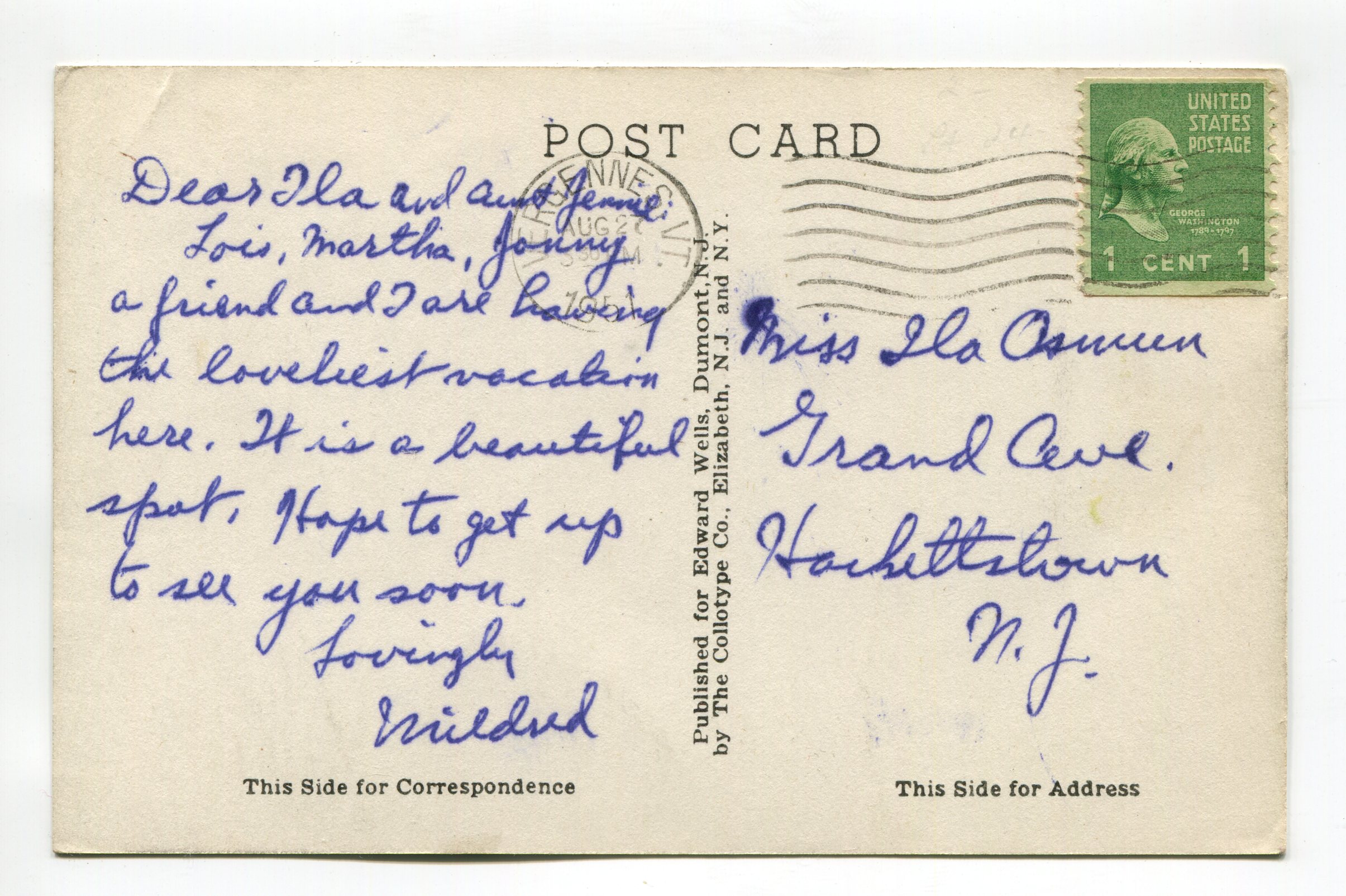 Condition – corner/edge wear, ink mark bled through to card front, crease in corners and in top edge near left corner, soiling/marks