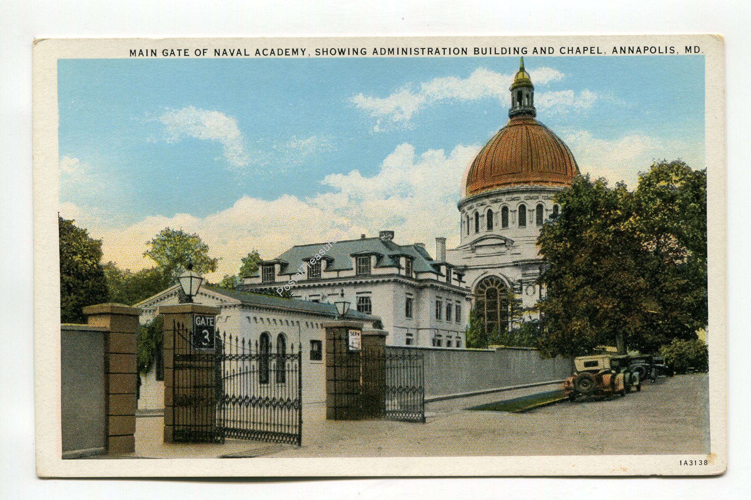 Main Gate of Naval Academy showing Administration Building and Chapel Annapolis Maryland postcard