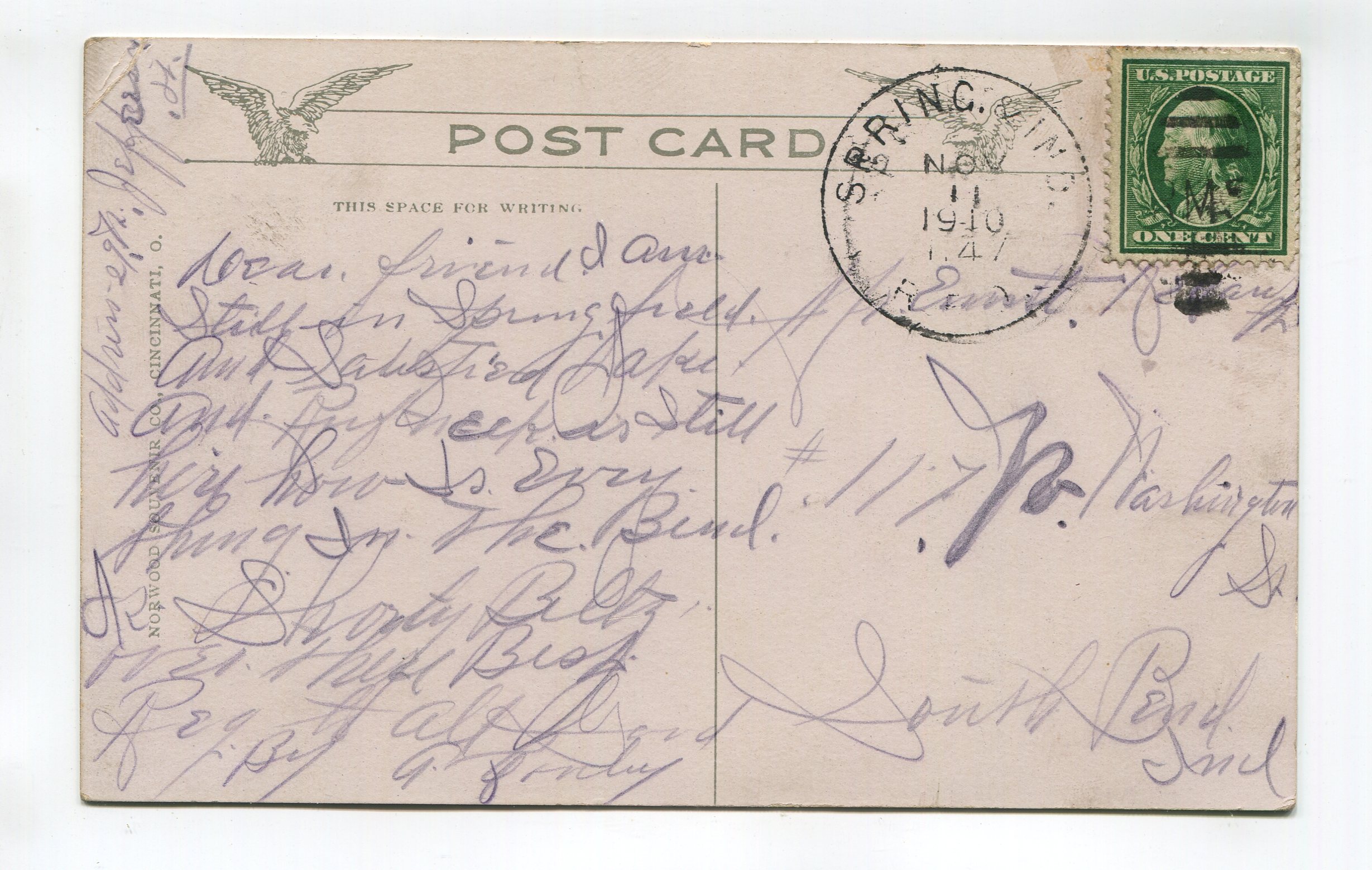 Condition – noticeable corner/edge wear, crease in corners and in top edge right of center, heavy crease by top right corner, rear message and cancelation impression visible on card front, dots creating large circle visible close to all edges, album impression marks around corners, marks on card front, soiling/marks