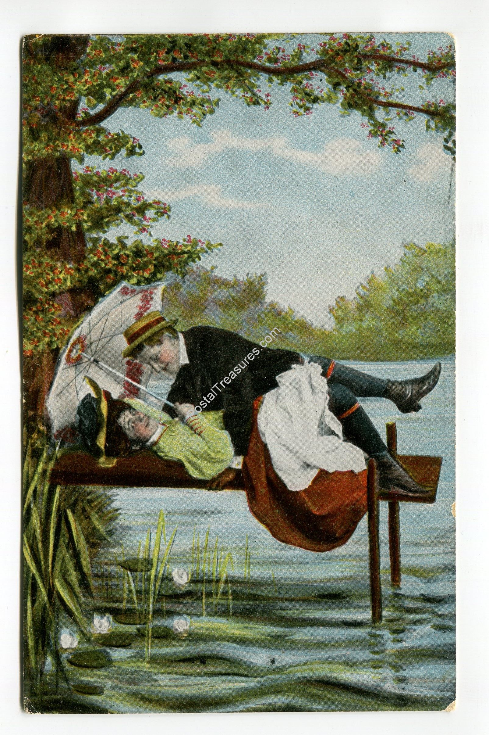 Man and women on boat landing postcard