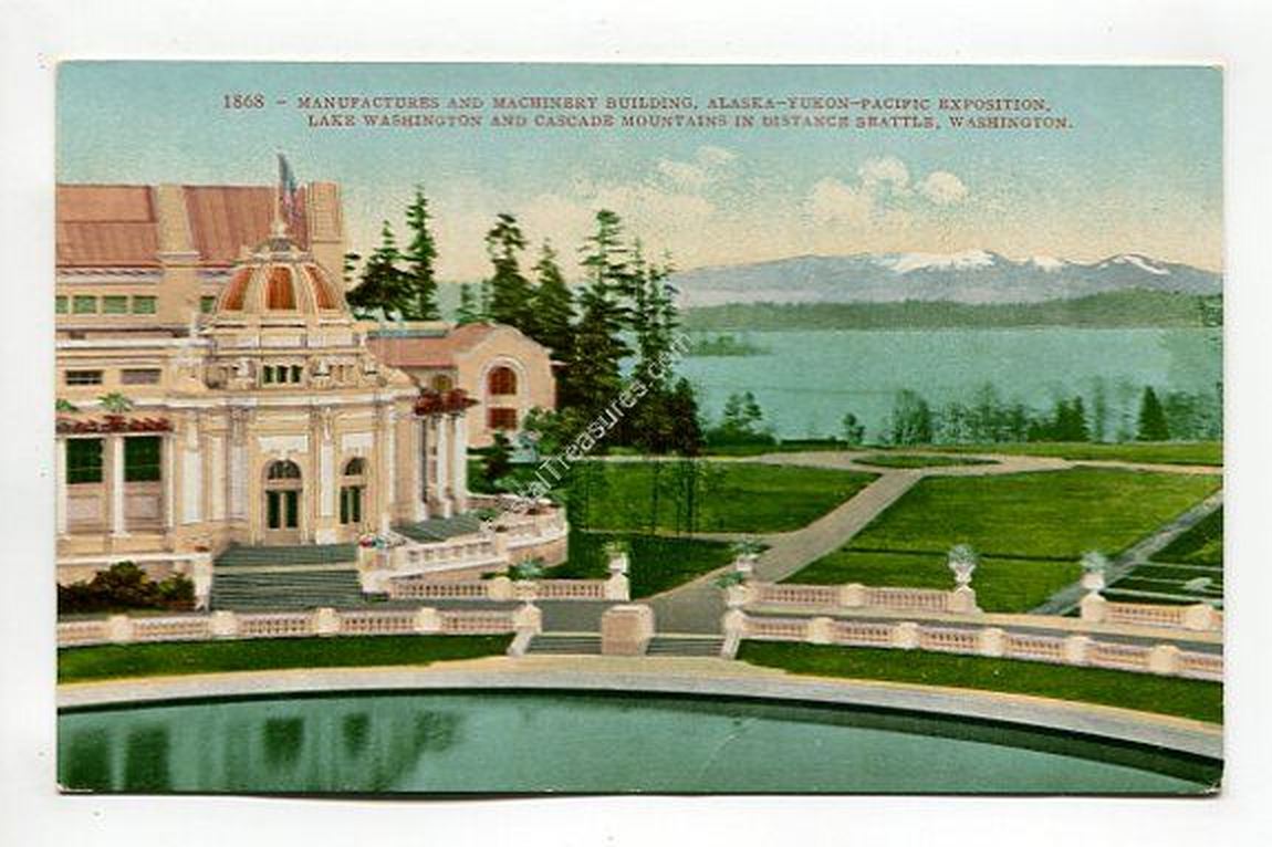 Manufactures and Machinery Building Basin Alaska-Yukon-Pacific Exposition Lake Washington and Cascade Mountains in Distance Seattle Washington postcard