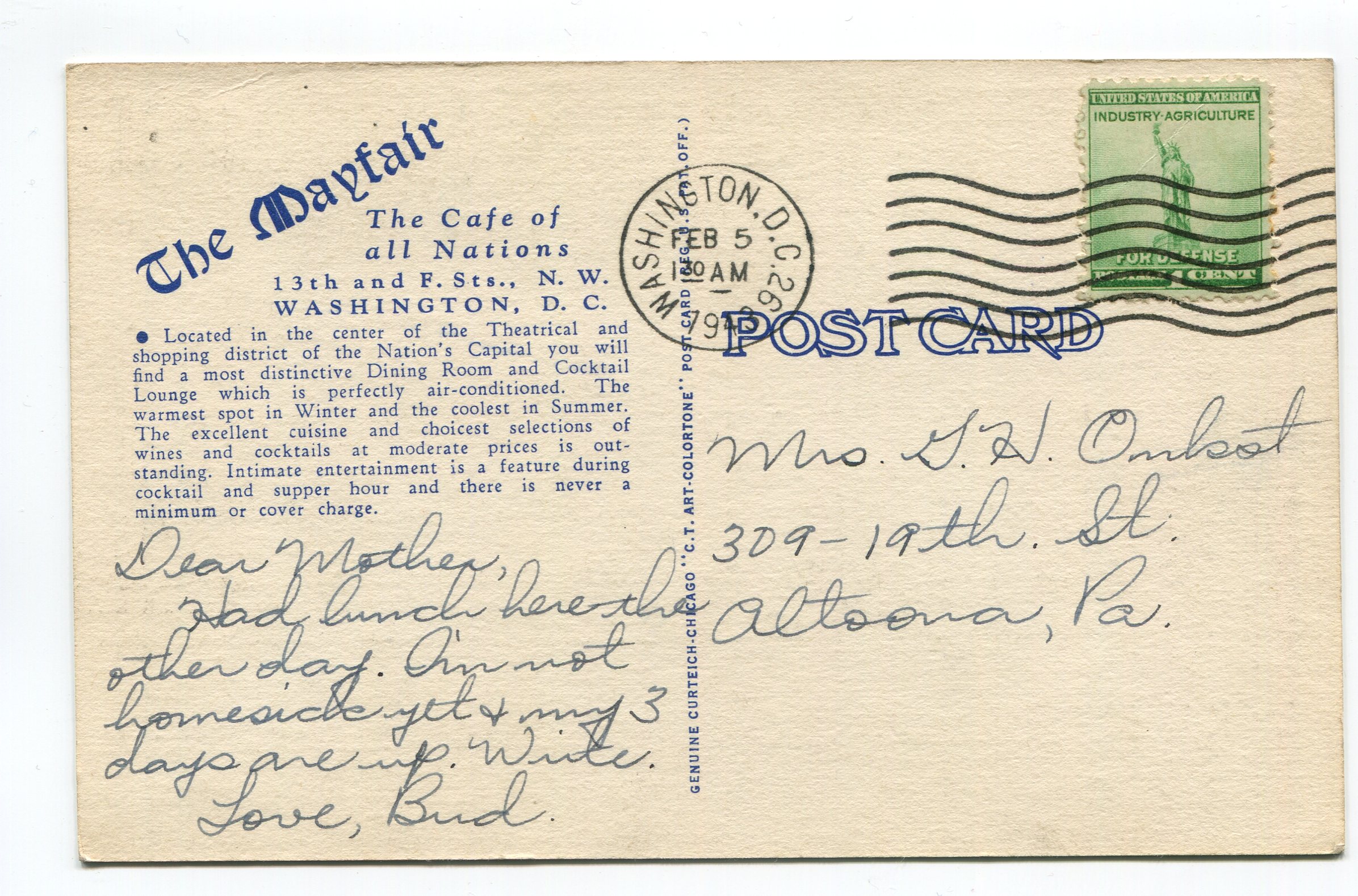 Mayfair Cafe 13th and F Streets NW Washington DC postcard