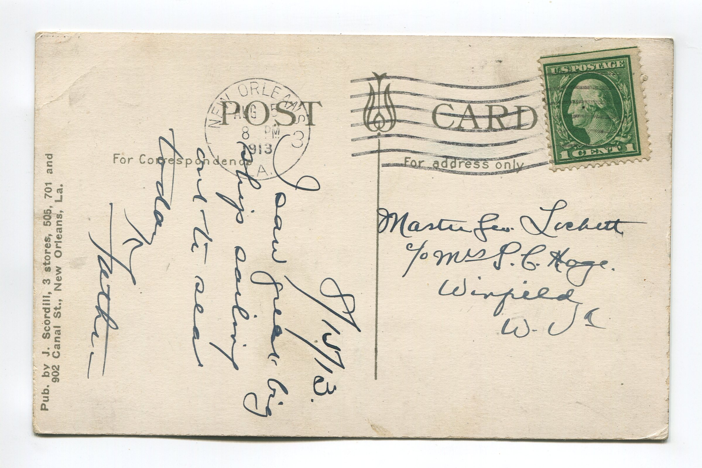 Condition – noticeable corner/edge wear, creases in corners and in lower right edge, cancellation impression visible on card front, soiling/marks