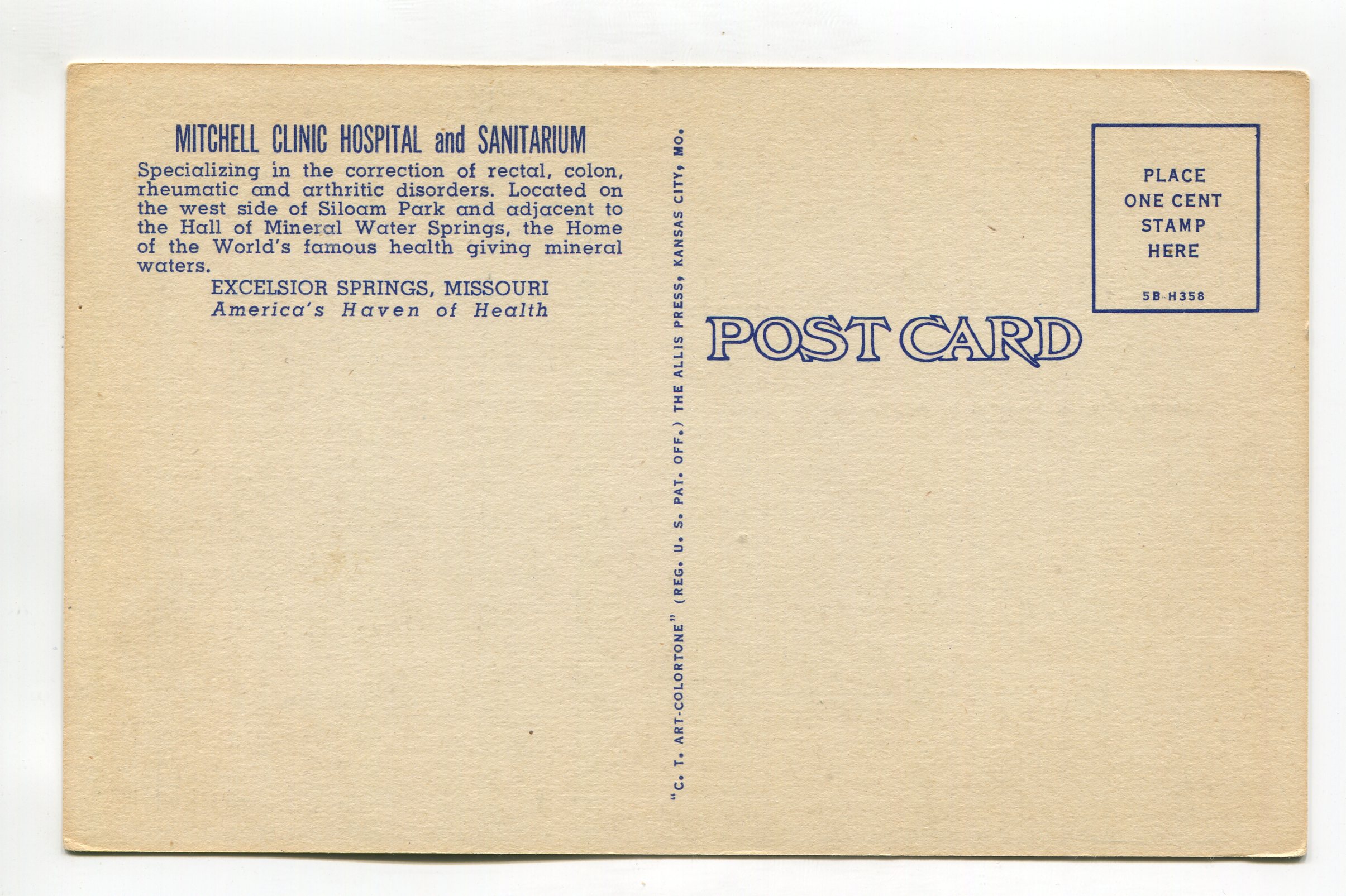 Mitchell Clinic Hospital and Sanitarium – Excelsior Springs Missouri postcard