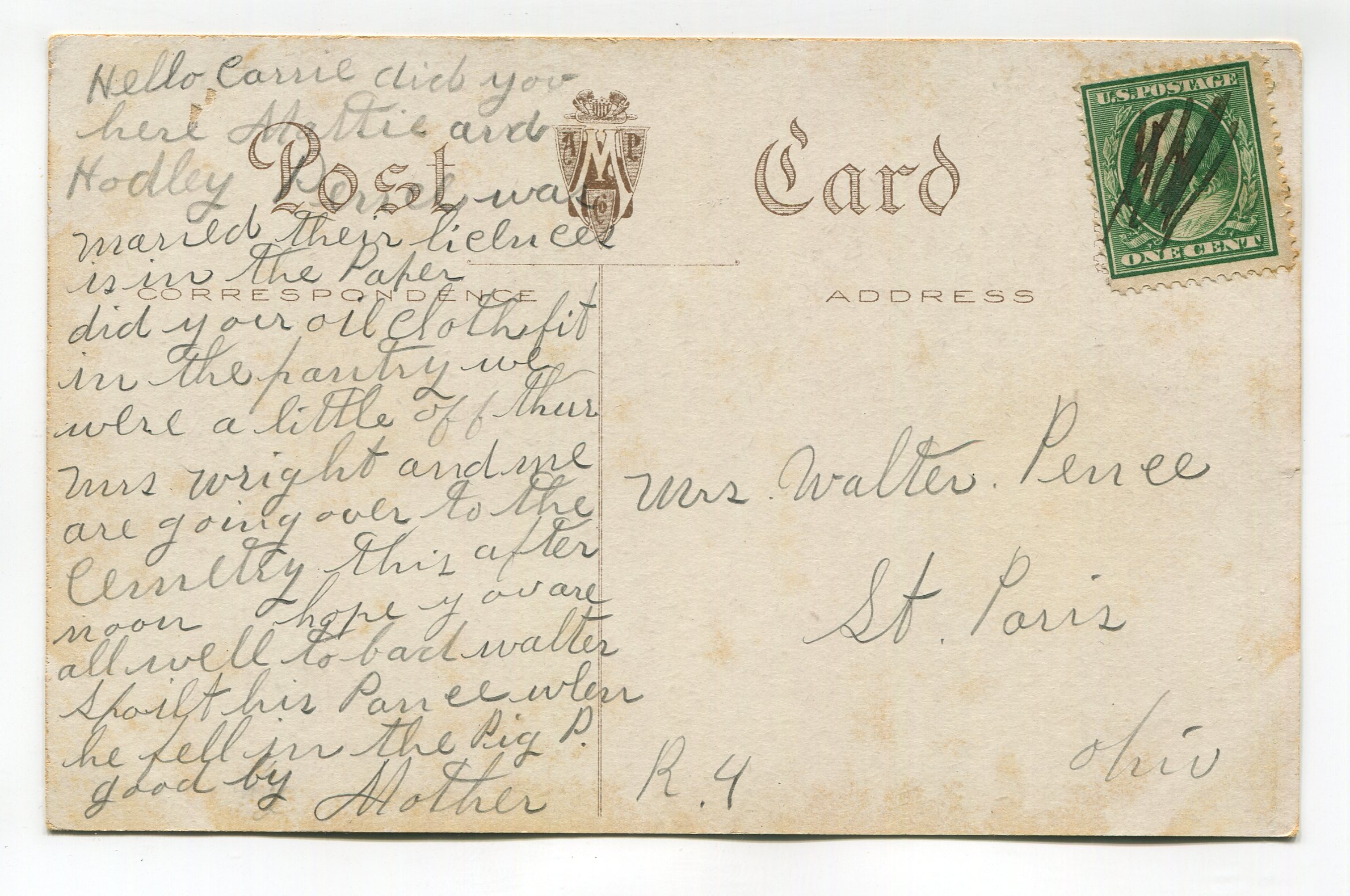 condition – noticeable corner/edge wear, crease in corners and in top edge left of center, nick in center of left edge, album impression marks around corners, rear message impression visible on card front, marks on card front, soiling/marks