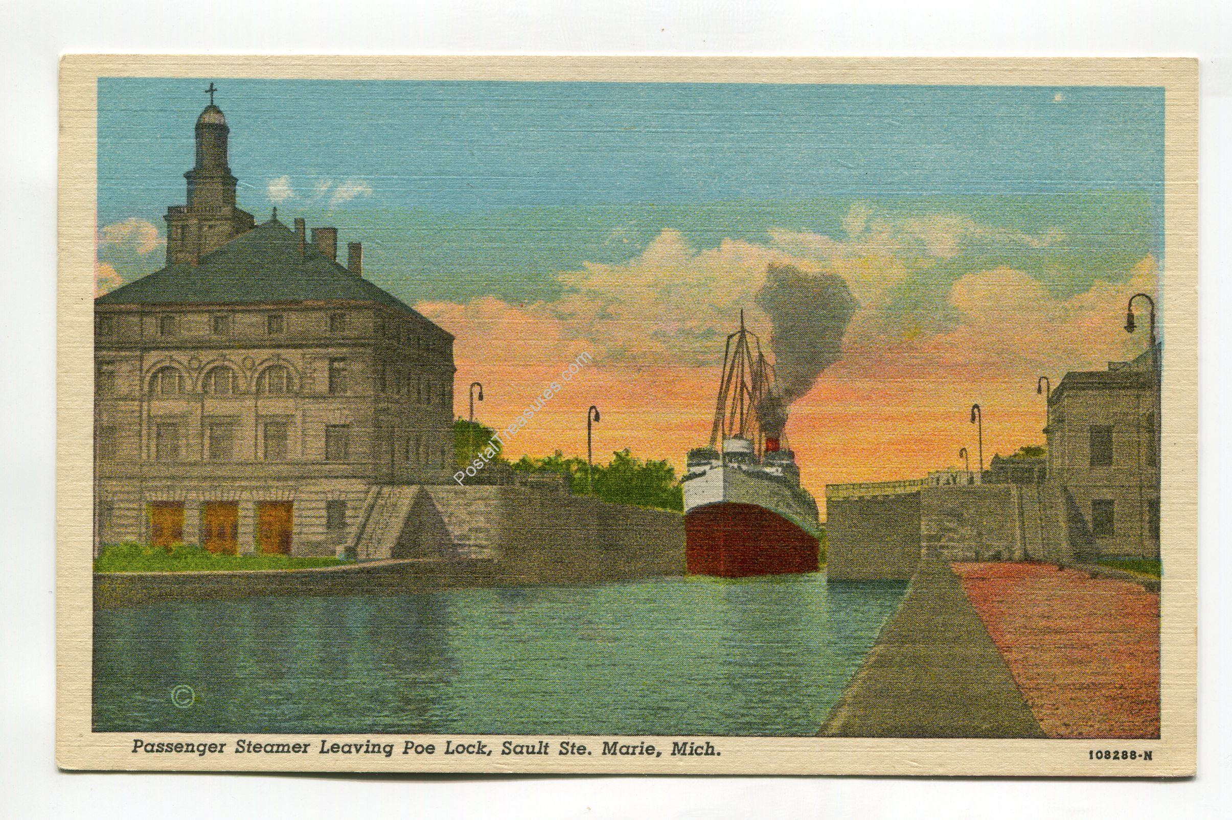 Passenger Steamer leaving Poe Lock Sault Ste Marie Michigan postcard