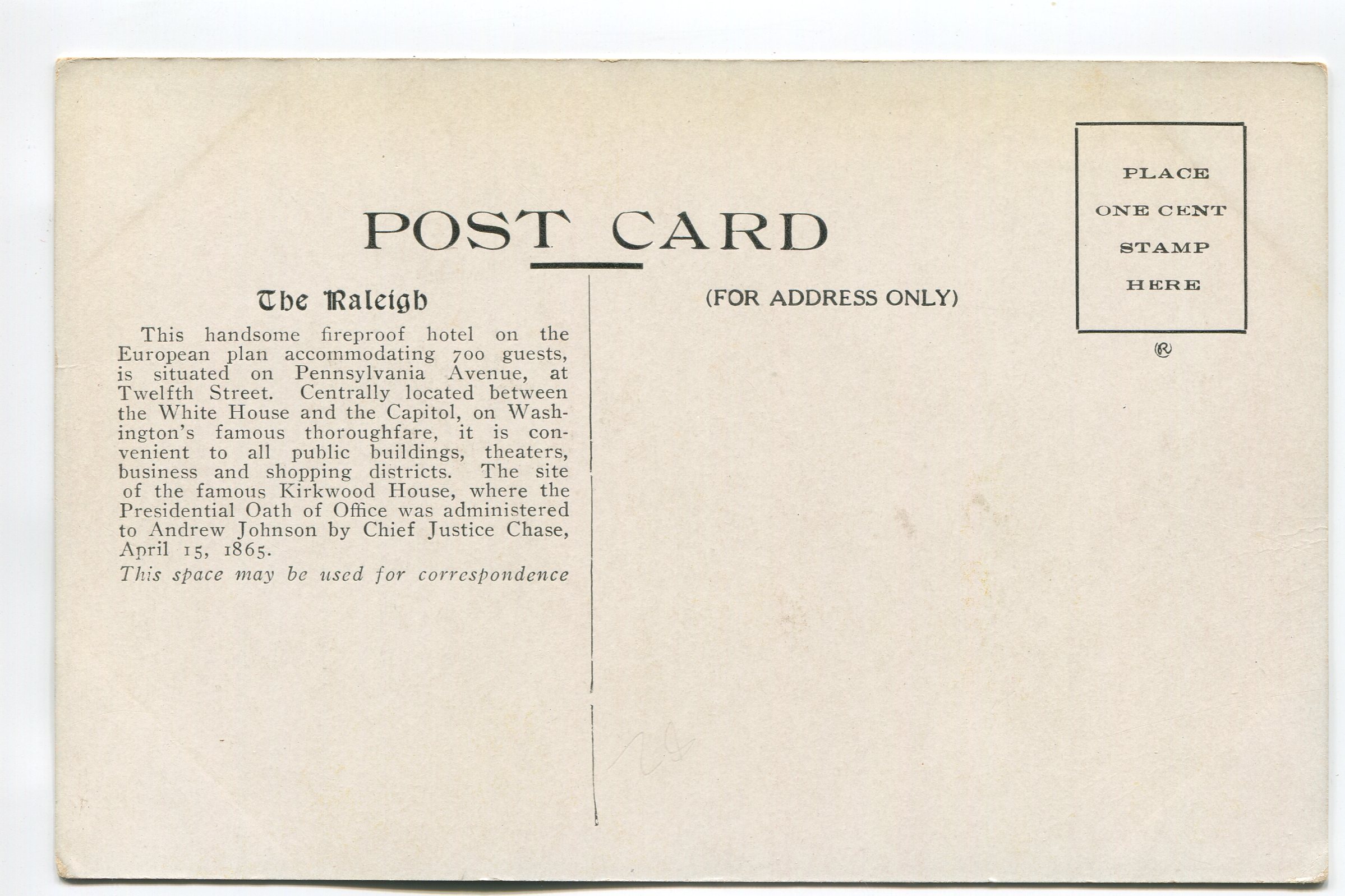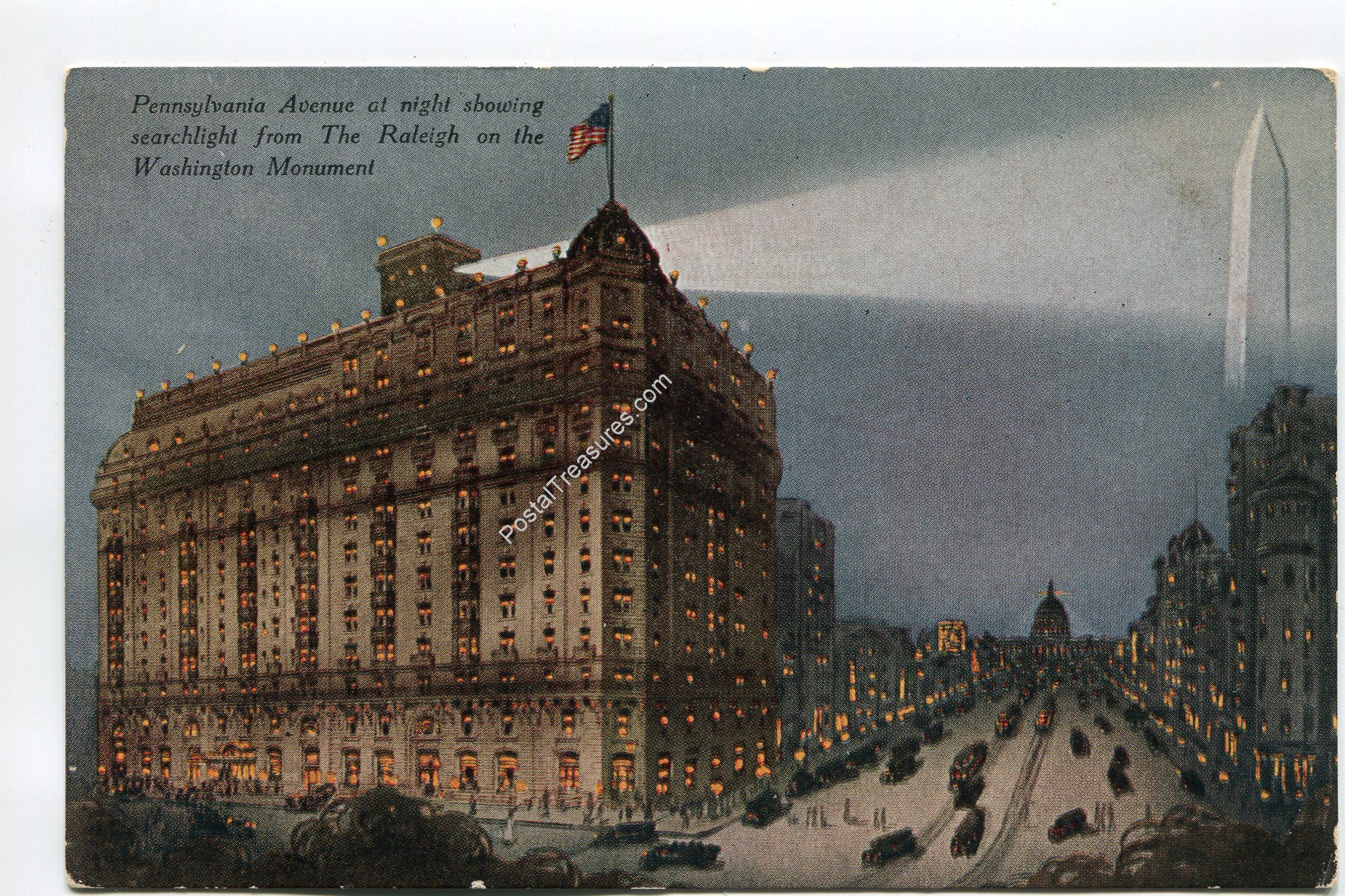 Pennsylvania Avenue at night showing searchlight from The Raleigh Washington DC postcard