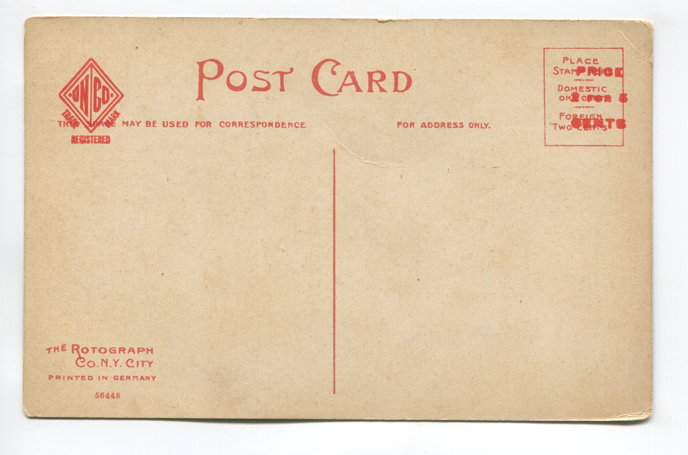 Condition – noticeable corner/edge wear, crease in corners and above card center, rear stamp box print impression visible on card front, soiling/marks