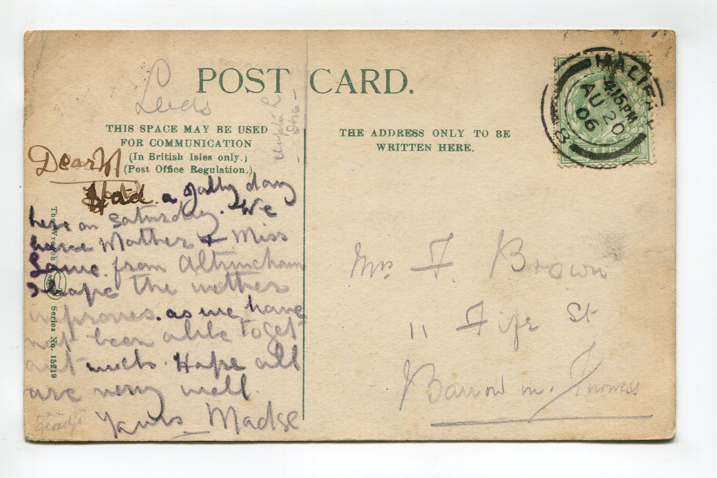 Condition – noticeable corner/edge wear, crease in corners and center of top edge, rear message impression and heavy cancelation mark visible on card front, marks on card front, album impression marks around corners, soiling/marks