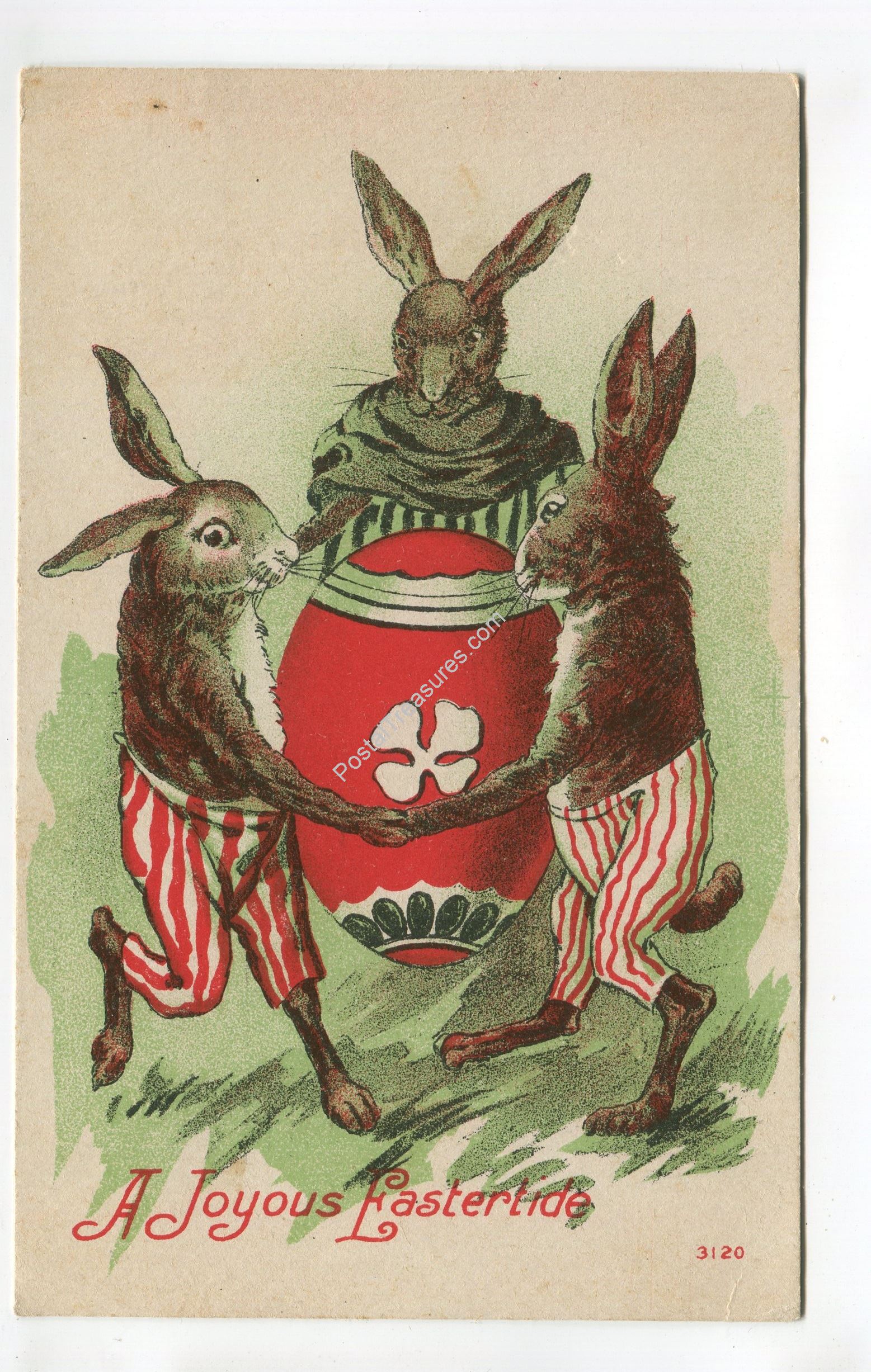 Rabbits dancing around Egg A Joyous Eastertide postcard