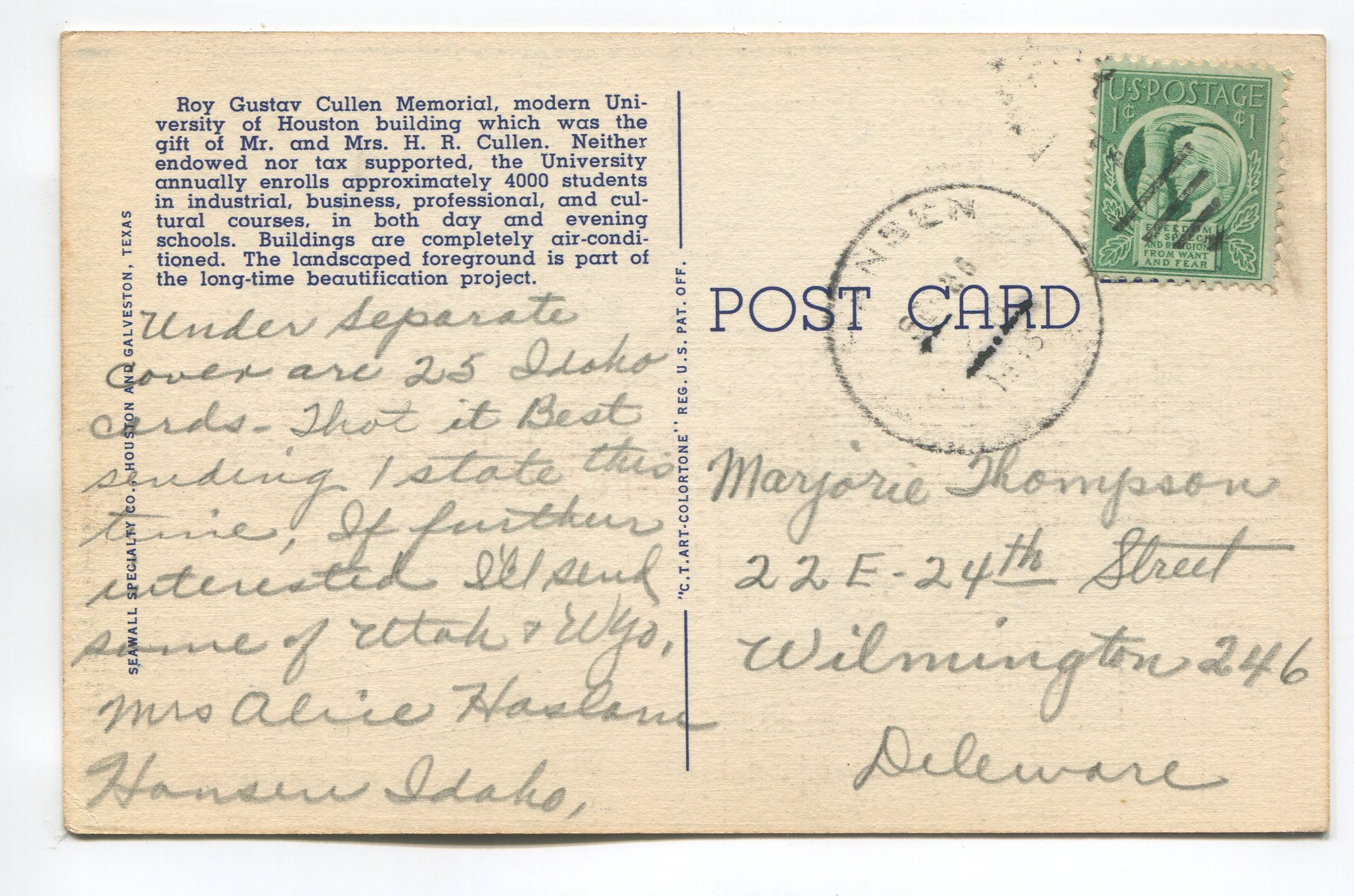 Roy Gustav Cullen Memorial University of Houston Texas postcard