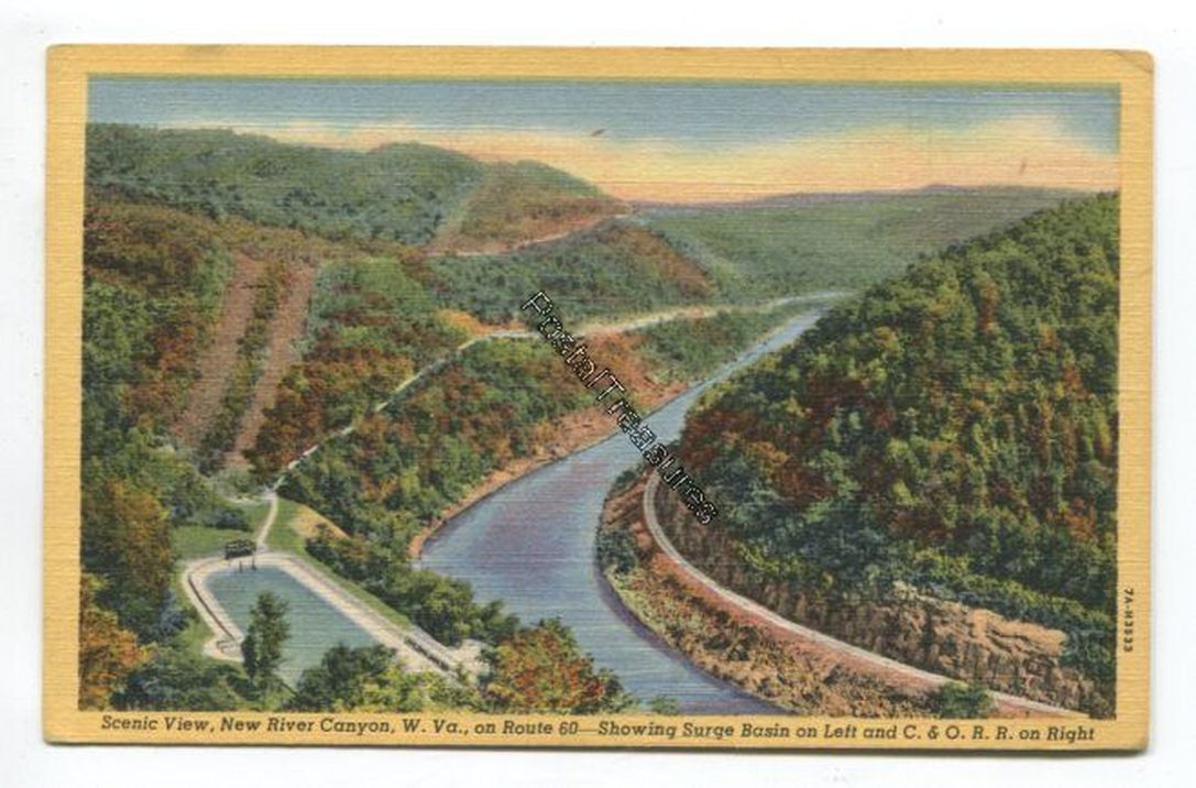 Scenic View New River Canyon West Virginia on Route 60 showing Surge Basin on left and C and O R R on right