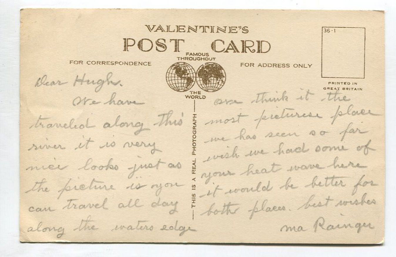 Condition – noticeable corner/edge wear, creases on right side of card, message impression visible on card front, soiling/marks
