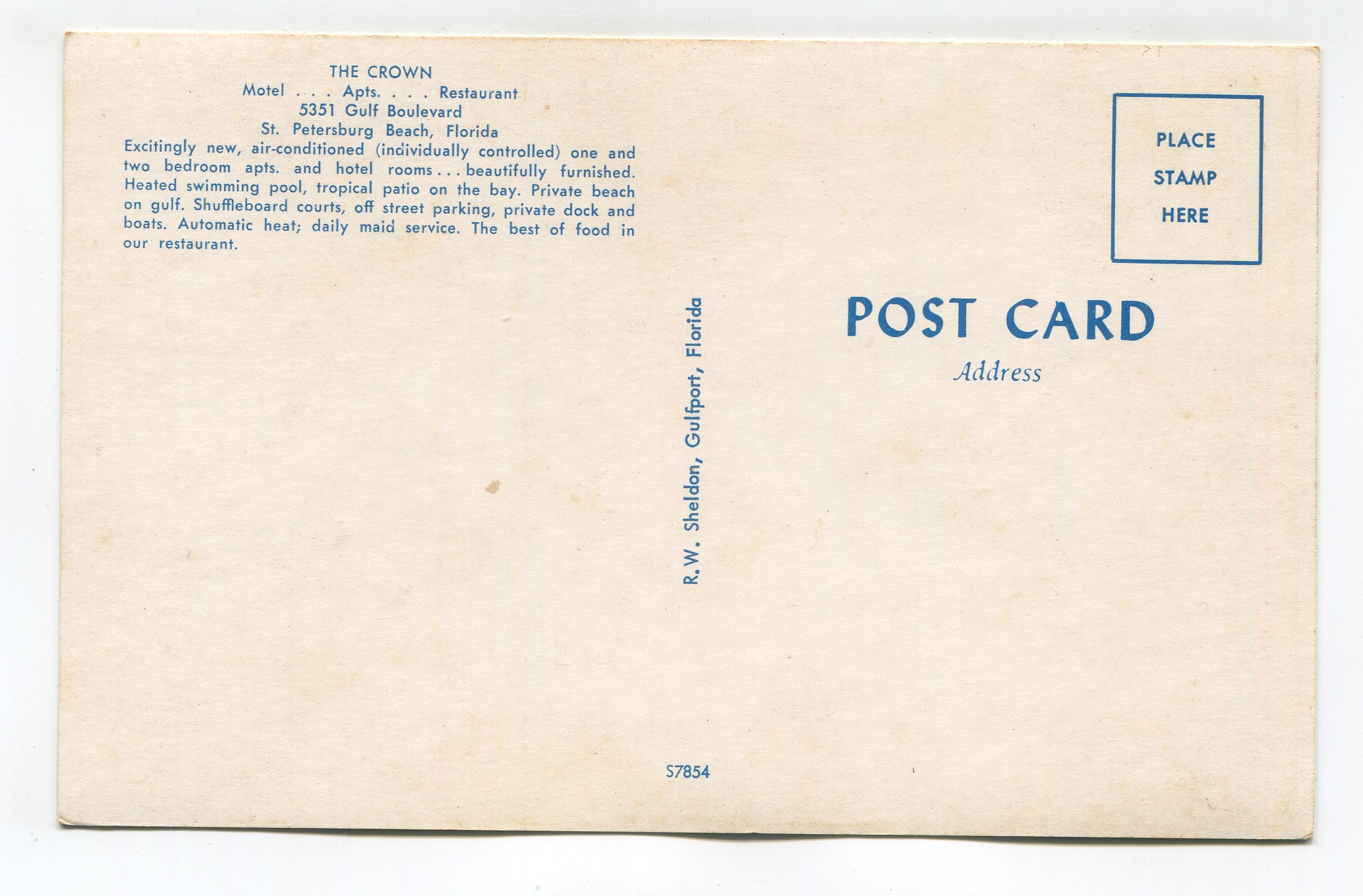 The Crown Motel – Apts – Restaurant 5351 Gulf Boulevard St Petersburg BeachFlorida postcard