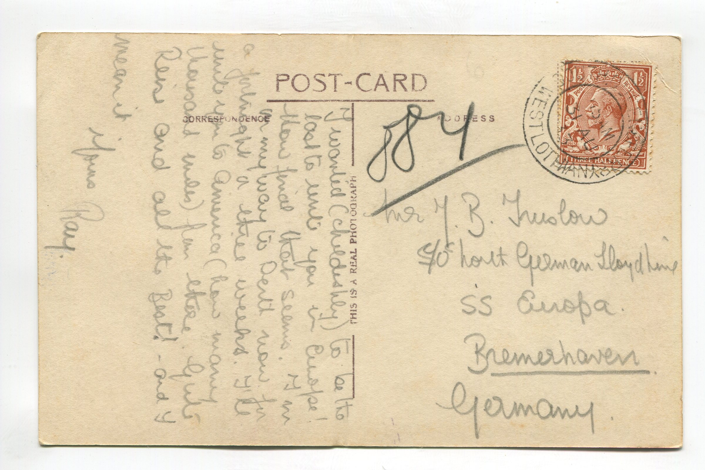 Condition – noticeable corner/edge wear, crease in corners and in center of top edge, cancellation and rear message impressions visible on card front, soiling/marks
