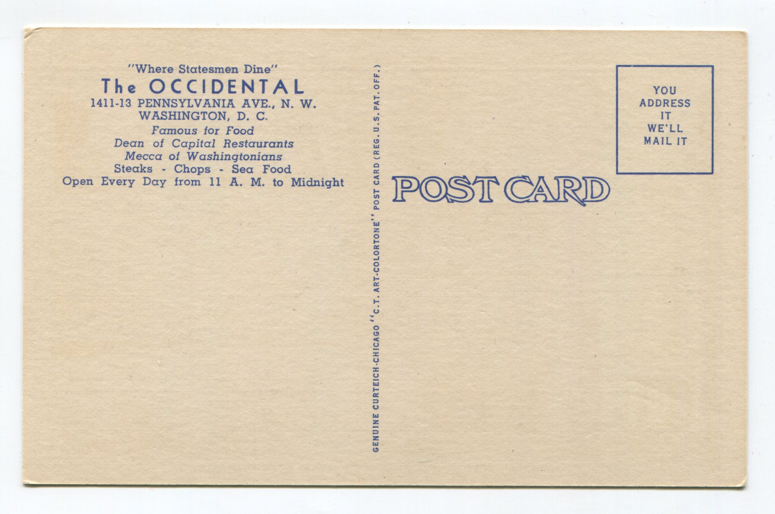 The Occidental Restaurant 1411-13 Pennsylvania Ave NW Washington DC postcard