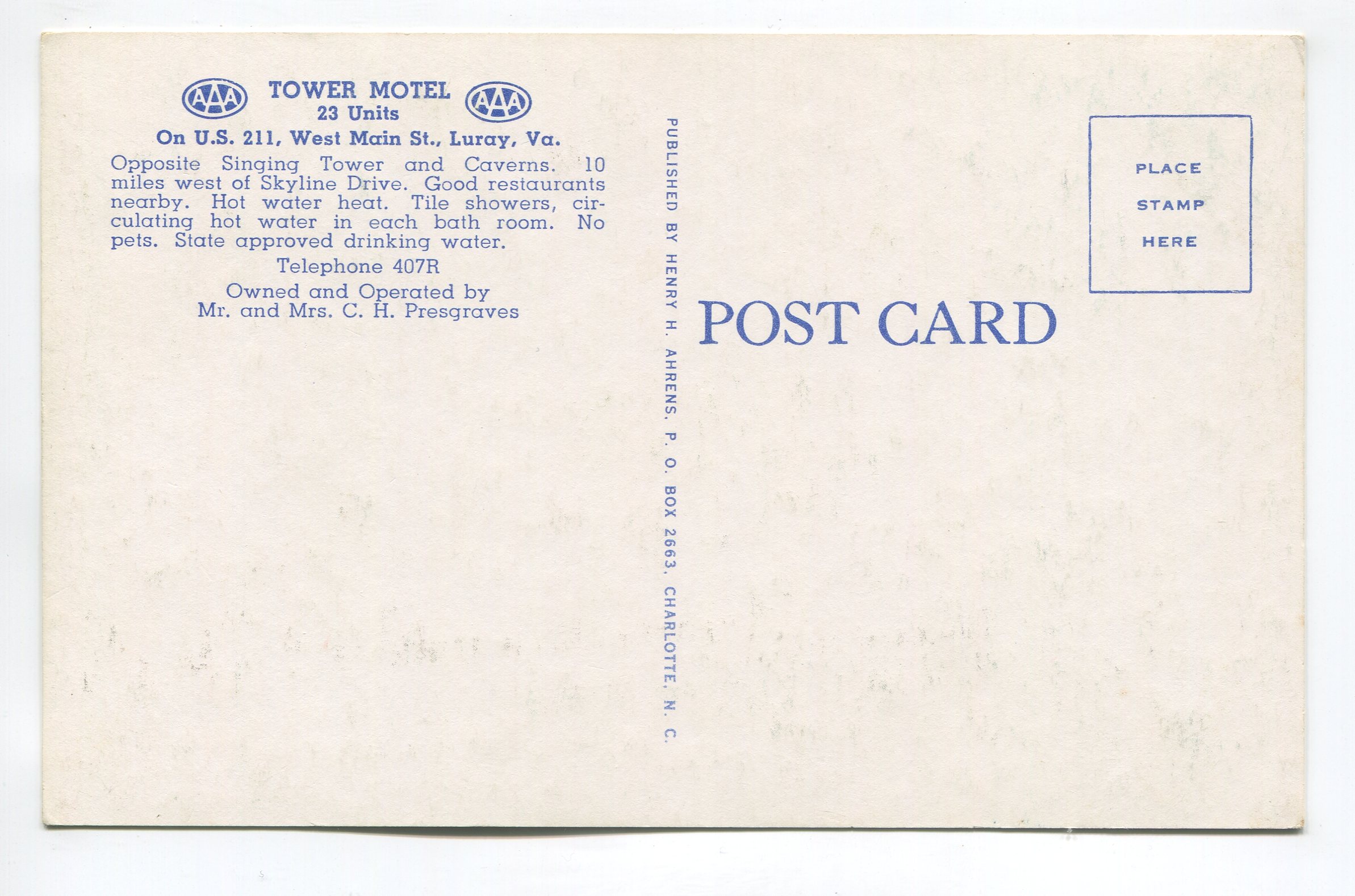 Tower Motel on US 211 West Main Street Luray Virginia