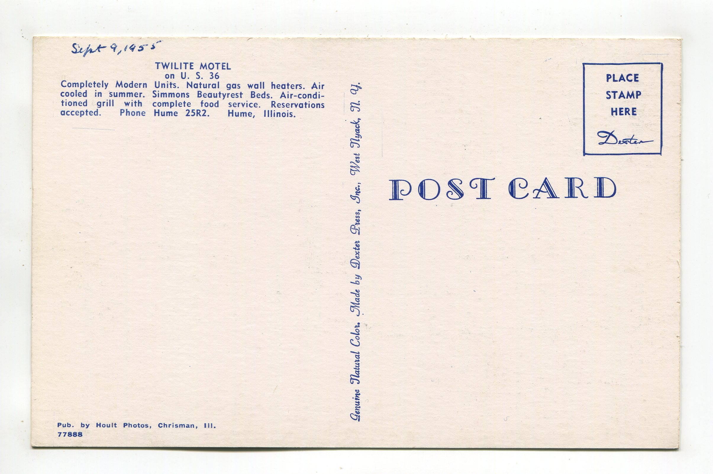 Twilite Motel on US 36 Hume Illinois postcard