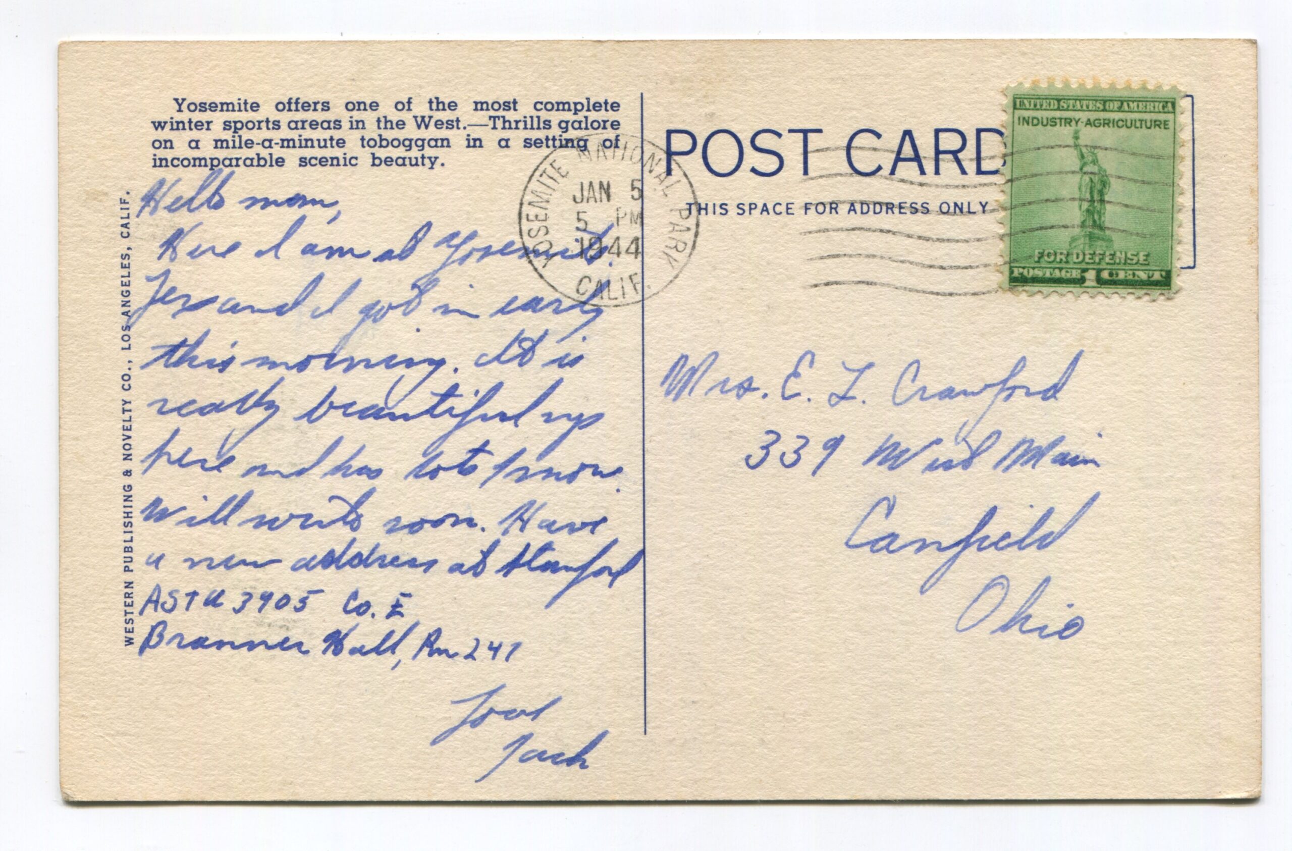 Winter Sports – Toboggan Slide Yosemite National Park postcard