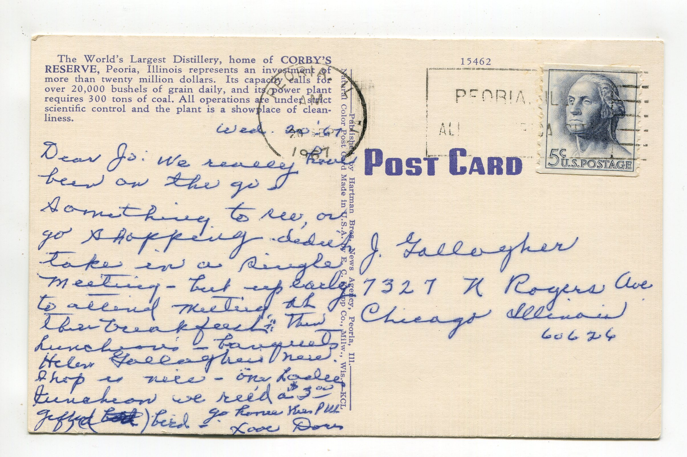 World’s Largest Distillery Home of Corby’s Reserve Peoria Illinois postcard
