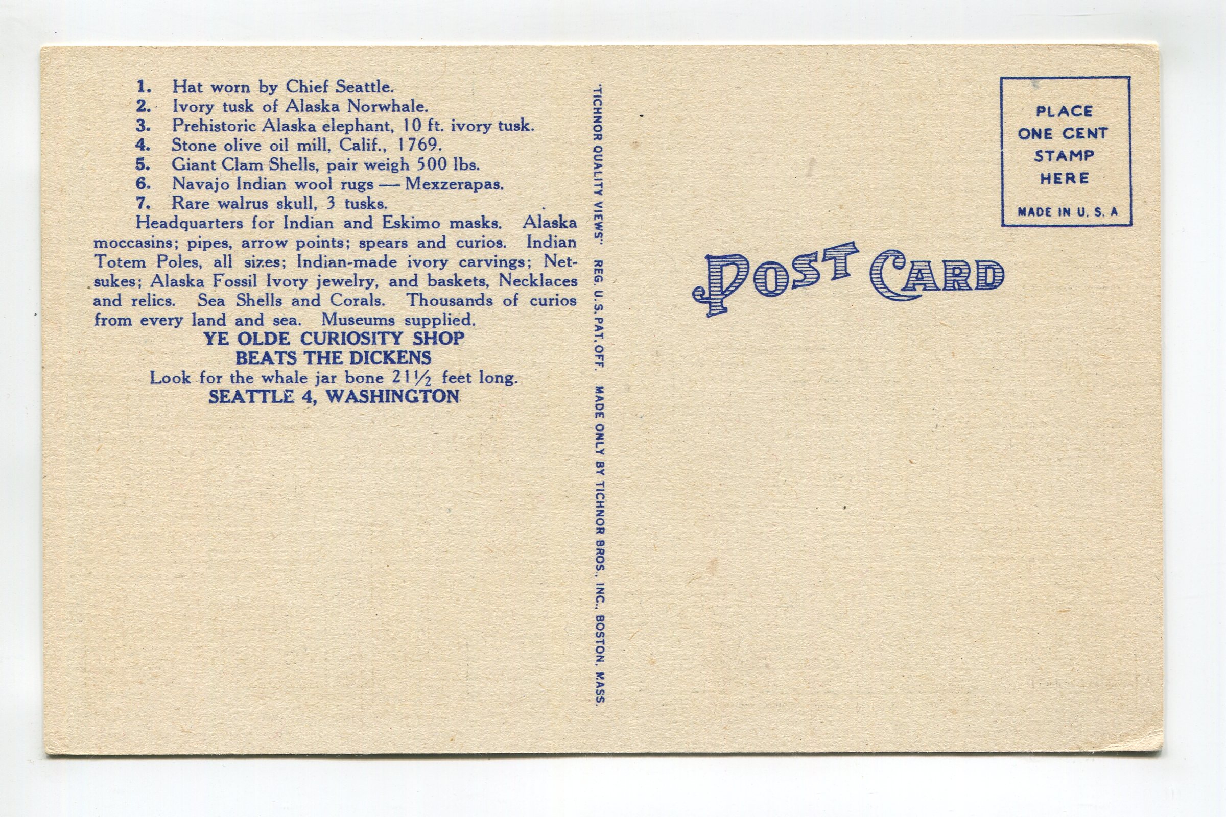Ye Olde Curiosity Shop Established by J E Ground Floor Entrance Colman Dock Seattle Washington postcard