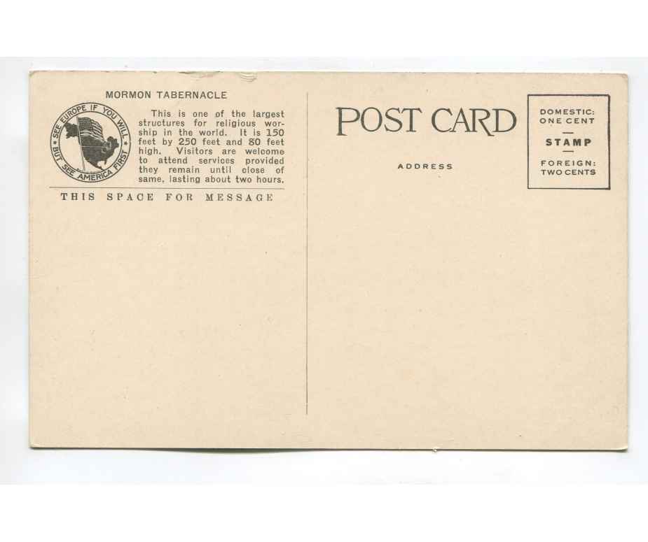 Mormon Tabernacle Salt Lake City Utah Sea Gull Monument in Foreground postcard