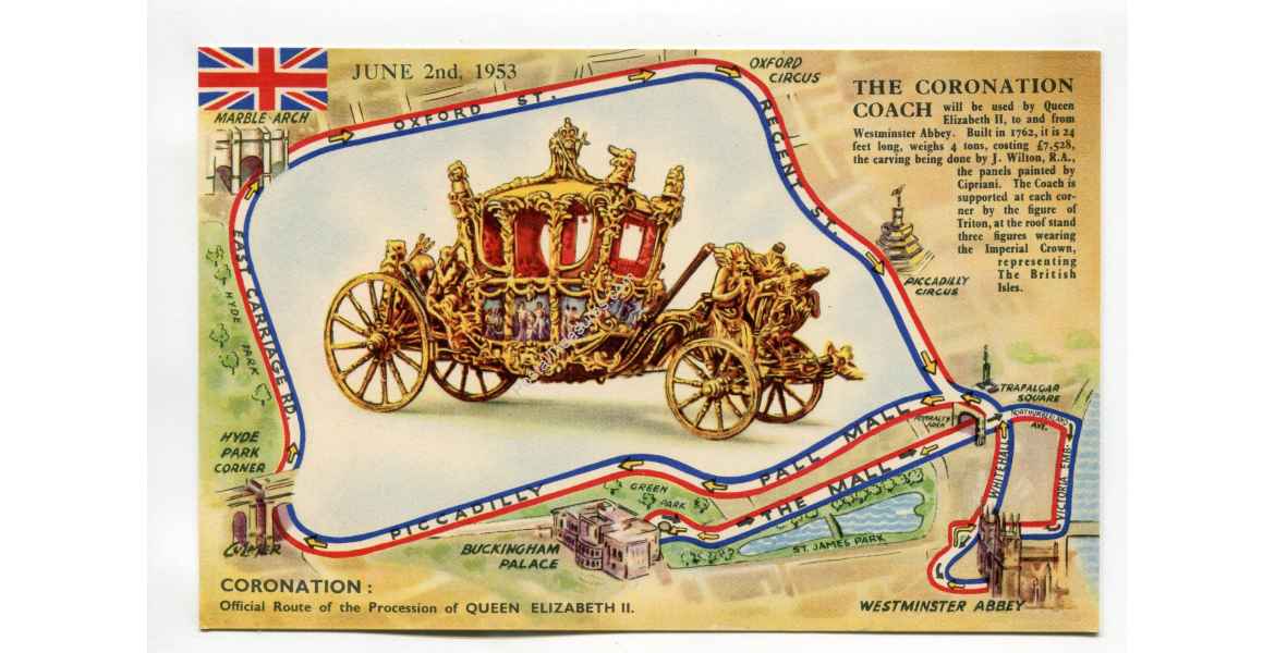 But it doesn’t stop there – Queen Elizabeth was then transported to Westminster Abbey for the Coronation. Westminster Abbey is now a World Heritage Site that has thousands of years of history. I was amazed to learn that mostly all coronations were held there since 1066, along with numerous royal weddings. Having only seen Westminster Abbey from the outside I can attest it is a magnificent structure and can only dream what it would be like to walk down the approximate 300 foot aisle towards your coronation. My Westminster Abbey postcard has a view of the outside of the Abbey.