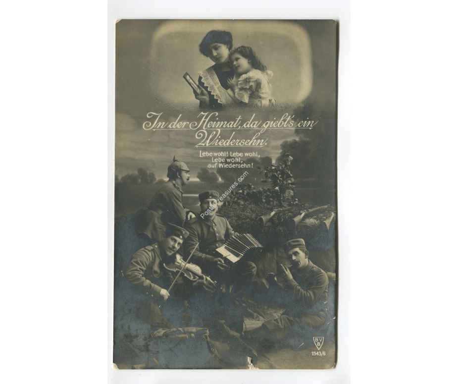 Condition - noticeable corner/edge wear, crease in corners and near upper right corner, tear in bottom edge right of center, heavy curl to card, marks on card front, soiling/marksIn der Heimat da giebts ein Wiedersehn postcard