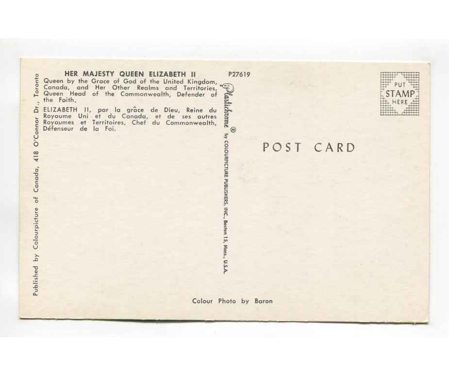 Her Majesty Queen Elizabeth II No 123E postcard Unused Condition - noticeable corner/edge wear, crease in corners, marks on card front, soiling/m..