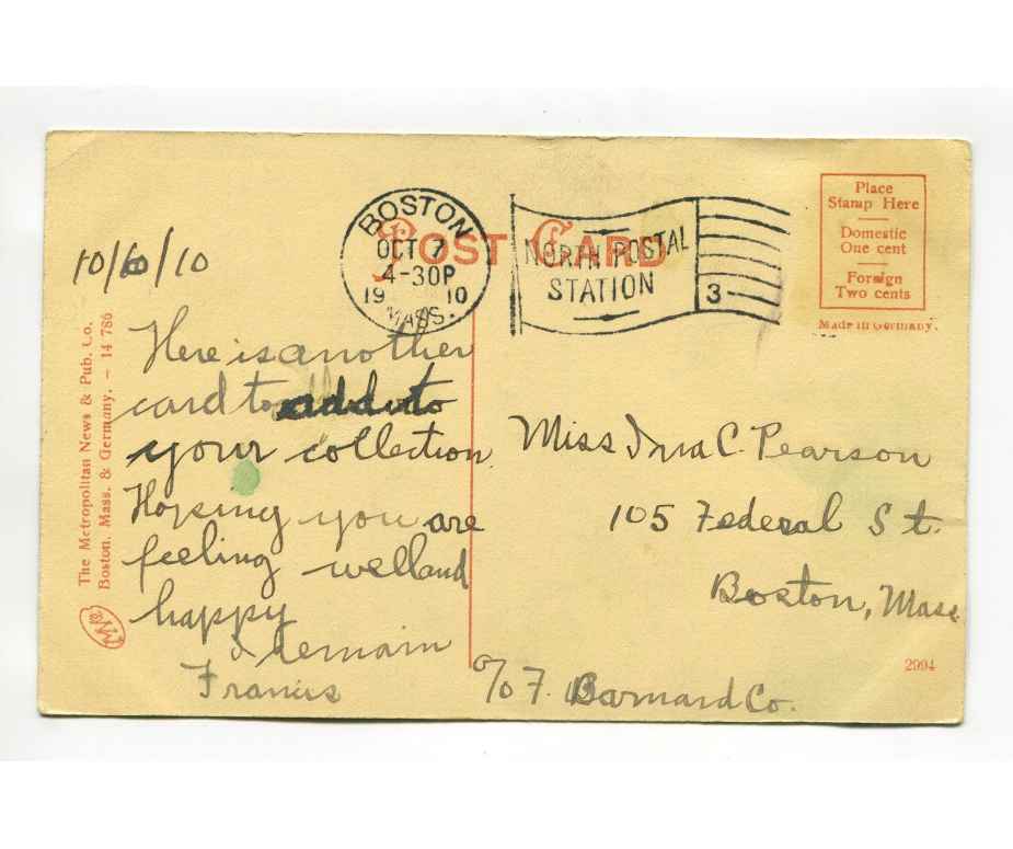 Memorial Hall Harvard College Cambridge Massachusetts postcard Used Postmark - 1910 Condition - noticeable corner/edge wear, album impres..
